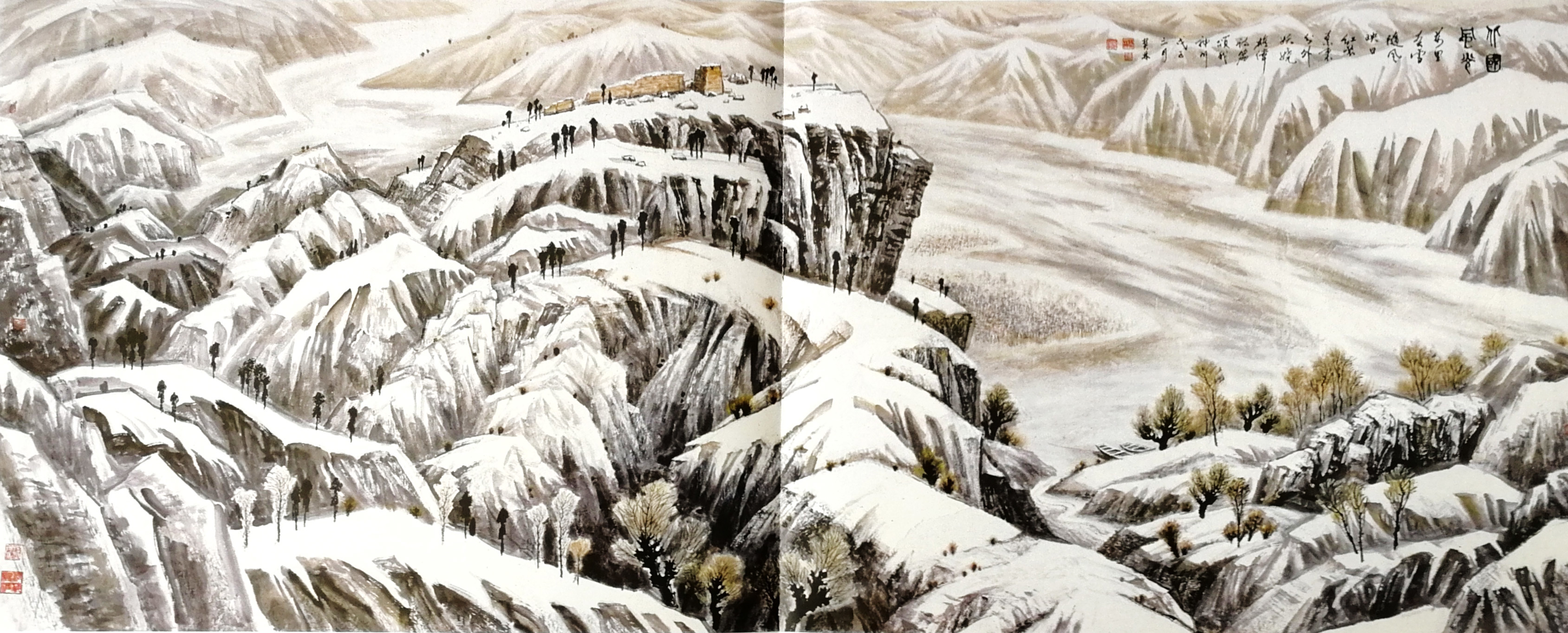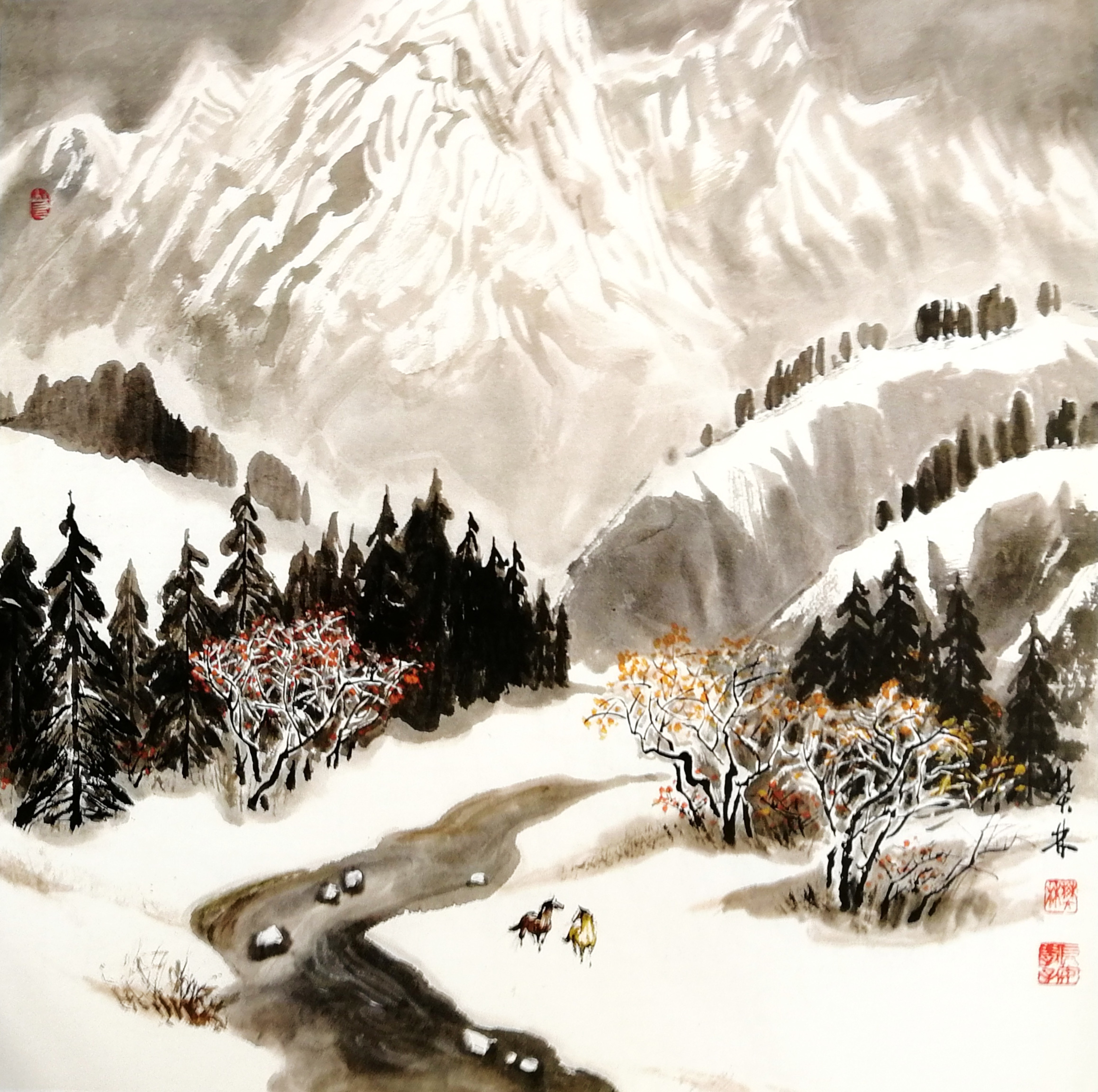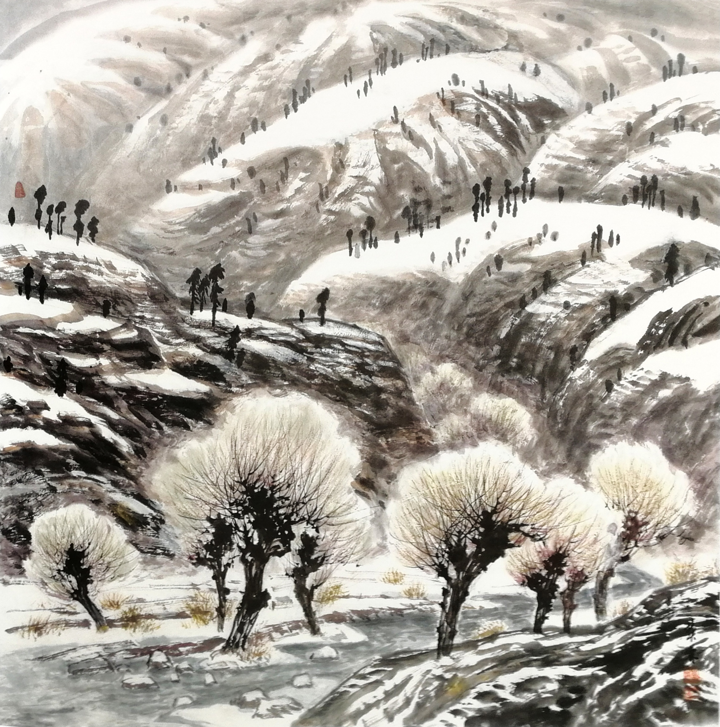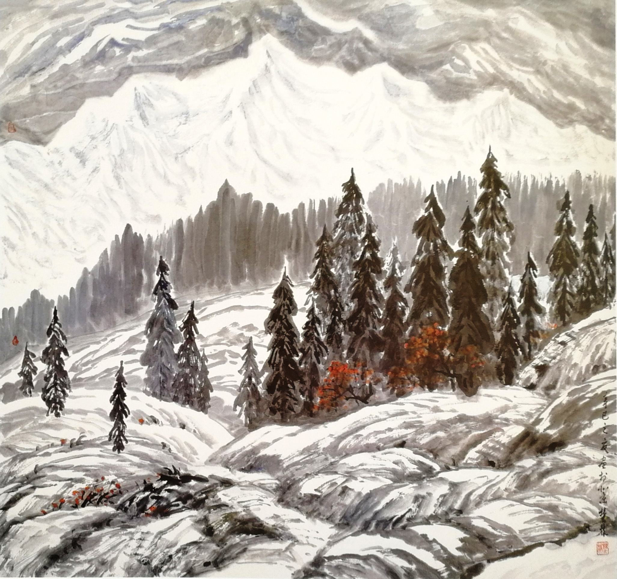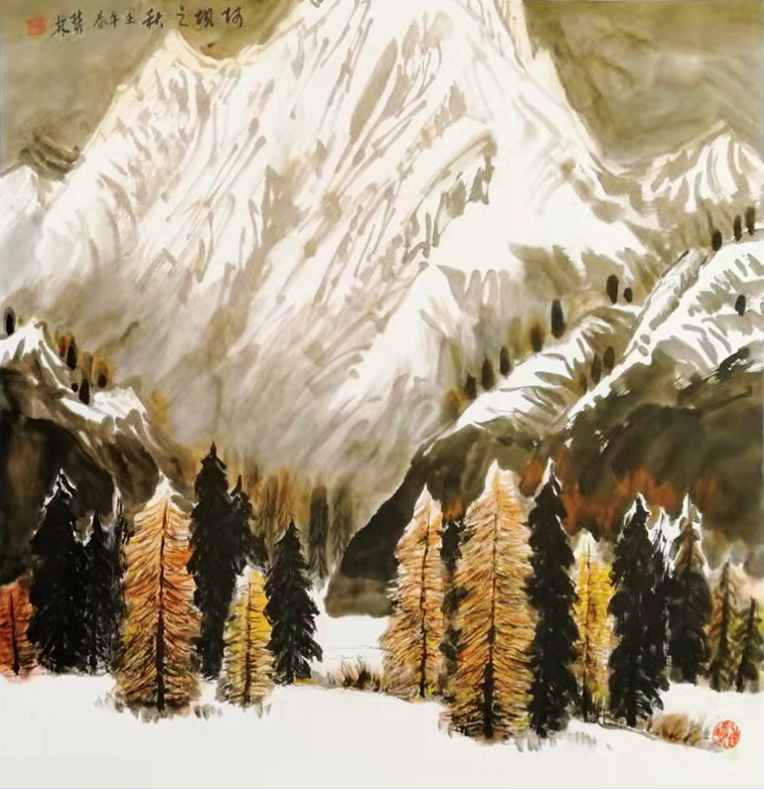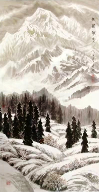 一次次采风赏雪,一次次的感悟,激情涌动,画了不少即兴作品。也有采风后积淀多年,如十月怀胎,又如春蚕吐丝,达十年之久才创作成画的,比如丈二作品《北国风光》(后被人民大会堂收藏)。