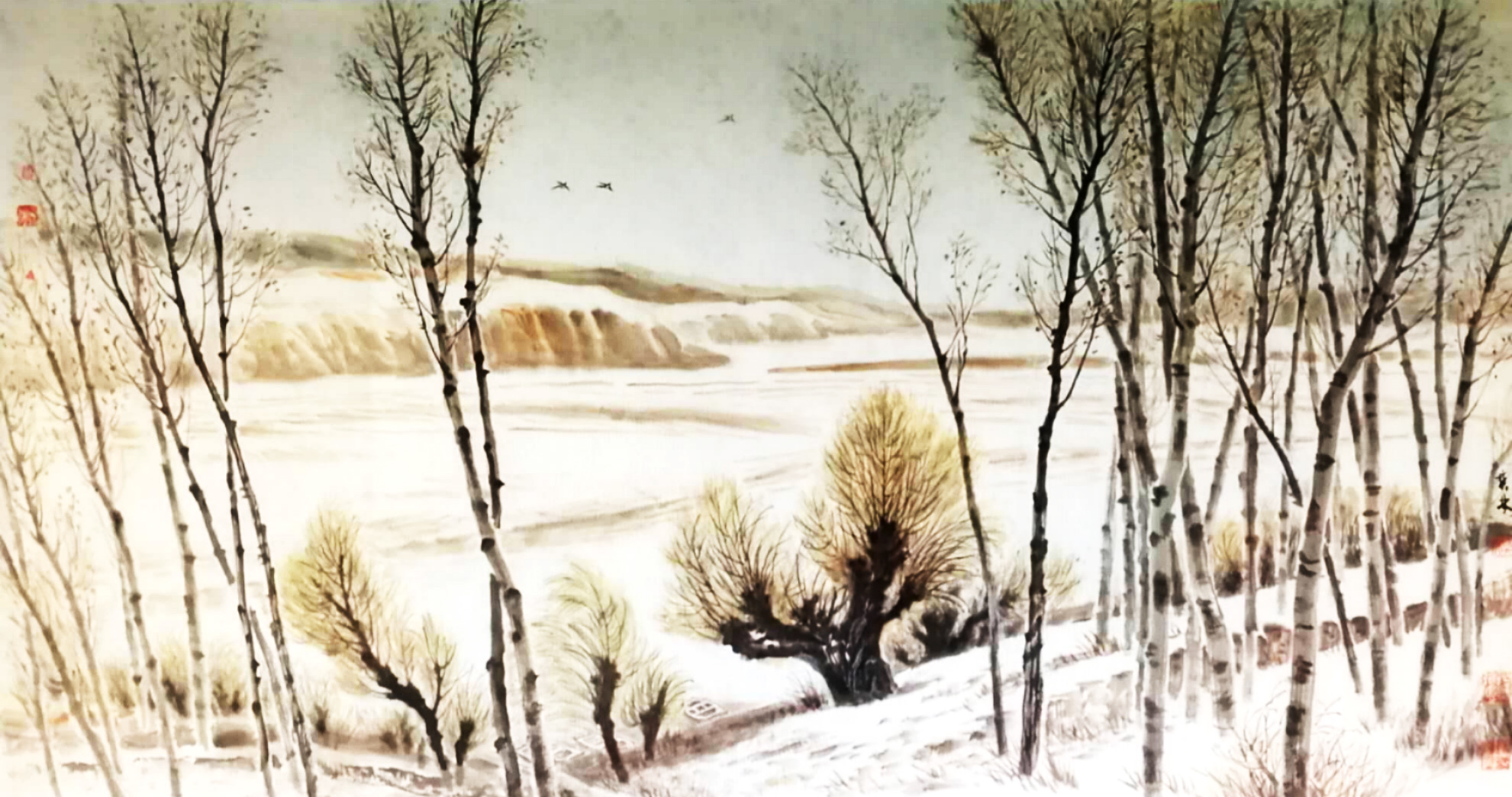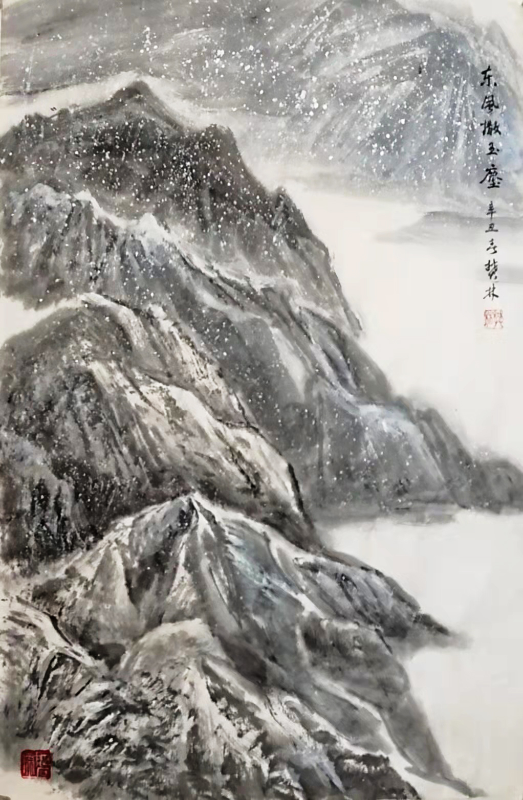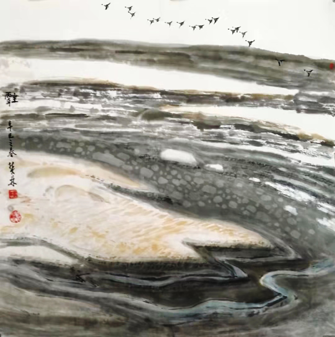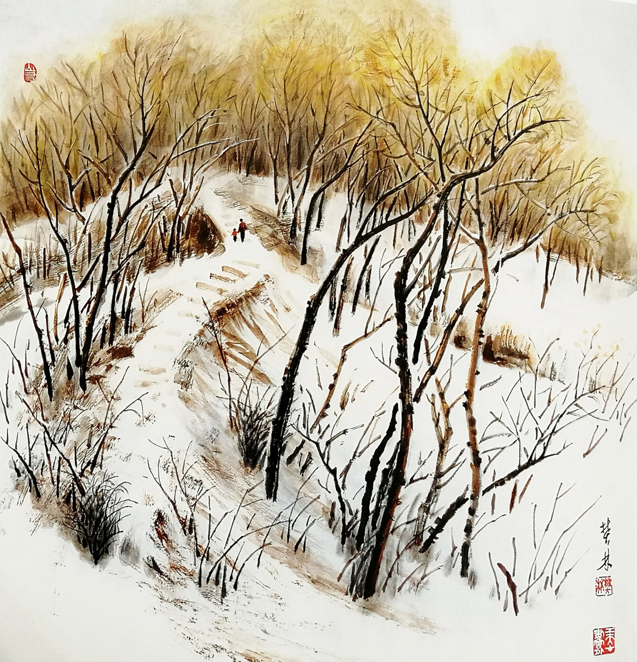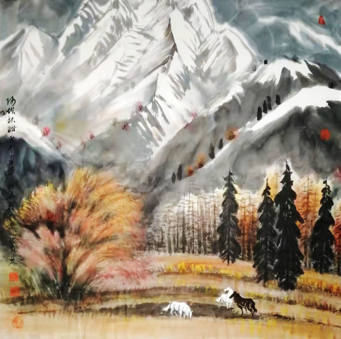 一次次采风赏雪,一次次的感悟,激情涌动,画了不少即兴作品。也有采风后积淀多年,如十月怀胎,又如春蚕吐丝,达十年之久才创作成画的,比如丈二作品《北国风光》(后被人民大会堂收藏)。