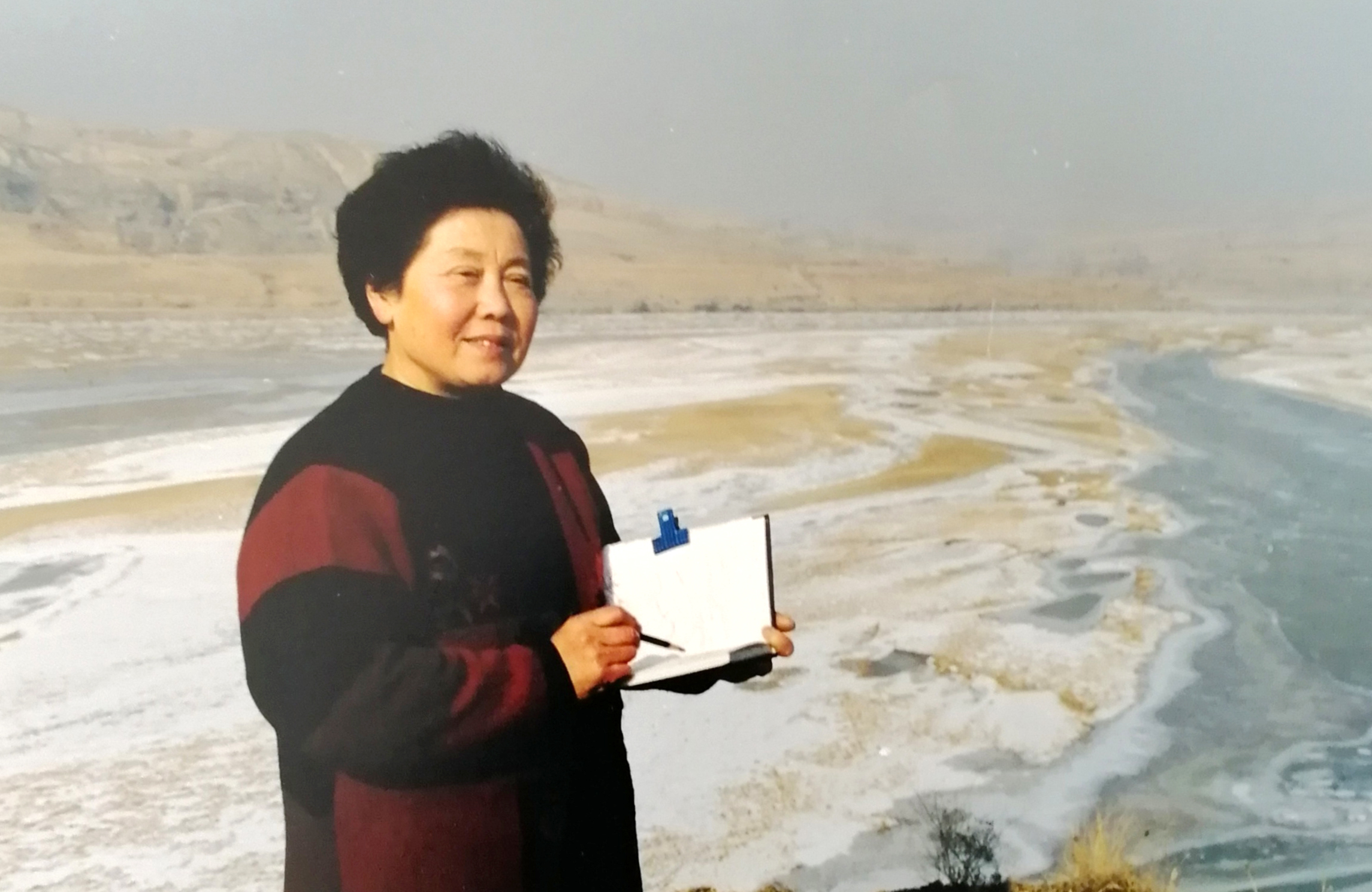 早年住和平里樱花园,距土城公园只有百步路。每当下雪,我总是第一个去公园欣赏。我更想到广阔的大自然里陶冶。1997年冬,一天晚间新闻报导第二天京郊下雪,我当即和老伴商量第二天到十渡赏雪。第二日凌晨四点打车到永定门车站,到十渡时只有我二人下车。我们租车从九渡往五渡走,有好景便停车画速写。大地披上银装,白茫茫一片,有棕色灌木丛点缀,蓝色小河沿山根蜿蜒流过,一两匹小马在静静地吃草,岸边的白杨直穿蓝天,山巅山腰飘洒了层层白雪,像仙女的衣裙,又像洁白的哈达,这一切是那么圣洁静谧。偶有几只喜鹊飞过,使我领会到“鸟鸣山更幽”的意境。这么美的雪景只有我二人享受,我们在宇宙的怀抱,这正是我们苦苦以求的“天人合一”的境界啊!