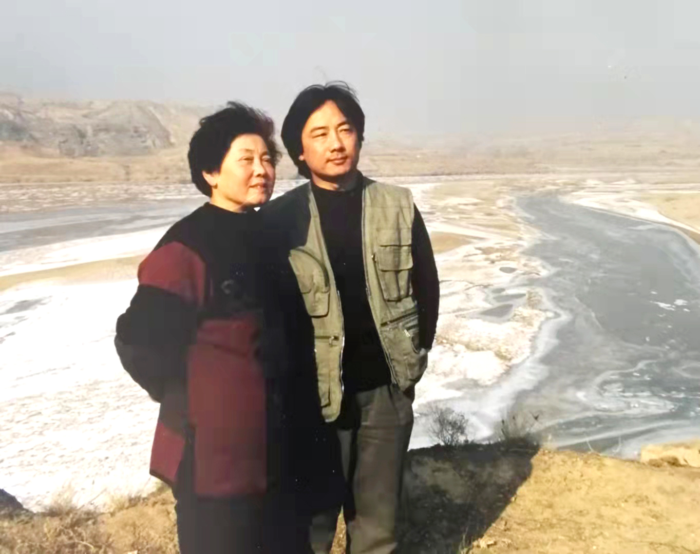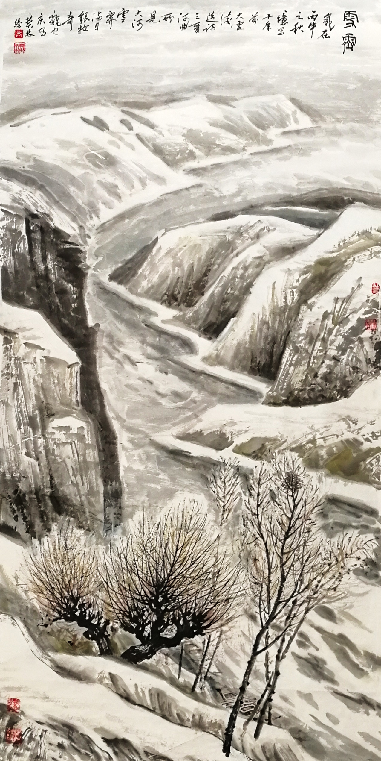 我喜欢毛泽东的《沁园春·雪》,想表现词中的意境,但还需进一步到大自然中了解体悟大塬大河雪景的气象。1998年12月7日,正是大雪节气,吾儿陪我到山西河曲采风。也许是我们的精神感动了上帝,车到神木纷纷扬扬地下起雪来,大地洒玉尘,黄河冰面上浮着一层层一道道雪,似玉带似玉龙。我终于感受到“千里冰封,万里雪飘,大河上下,顿失滔滔”的豪迈境界。傍晚又到黄河岸边,百年老龄疙瘩柳,足有五围粗,像巨人一般,黄河冰面上洒着道道金光,看不到它汹涌澎湃的身姿,但它像巨龙一样潜涌着。