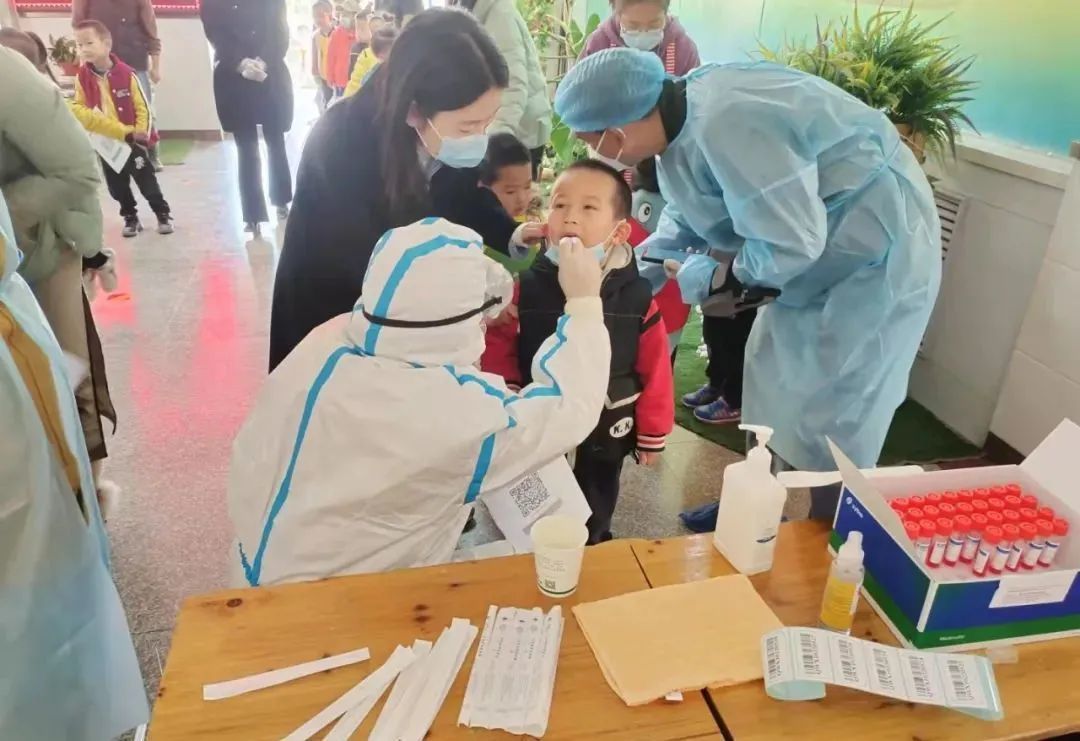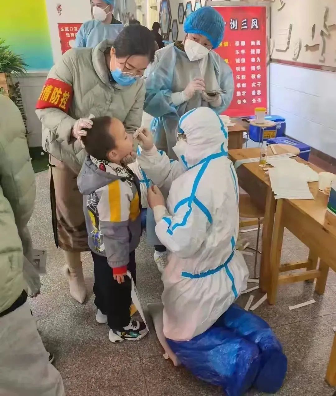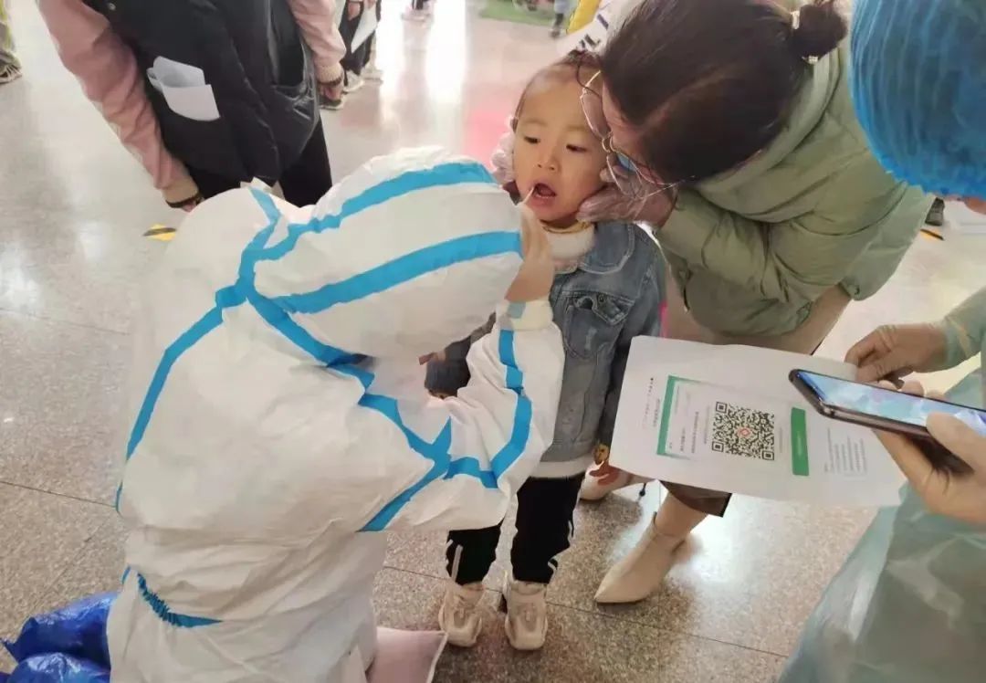 在高丽英耐心细致地引导下,孩子们也主动、勇敢的配合采集工作,看到高丽英长时间的跪在地上,幼儿园的老师拿来了垫子,细心地垫在了膝盖下面,防止膝盖受凉损伤,而做完检测的孩子们也不忘向高丽英鞠躬表达感谢。三个小时的时间,高丽英和同事们完成了全园284名师生的核酸采样工作。