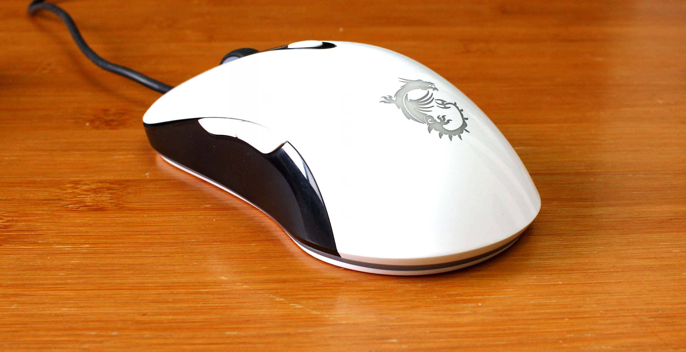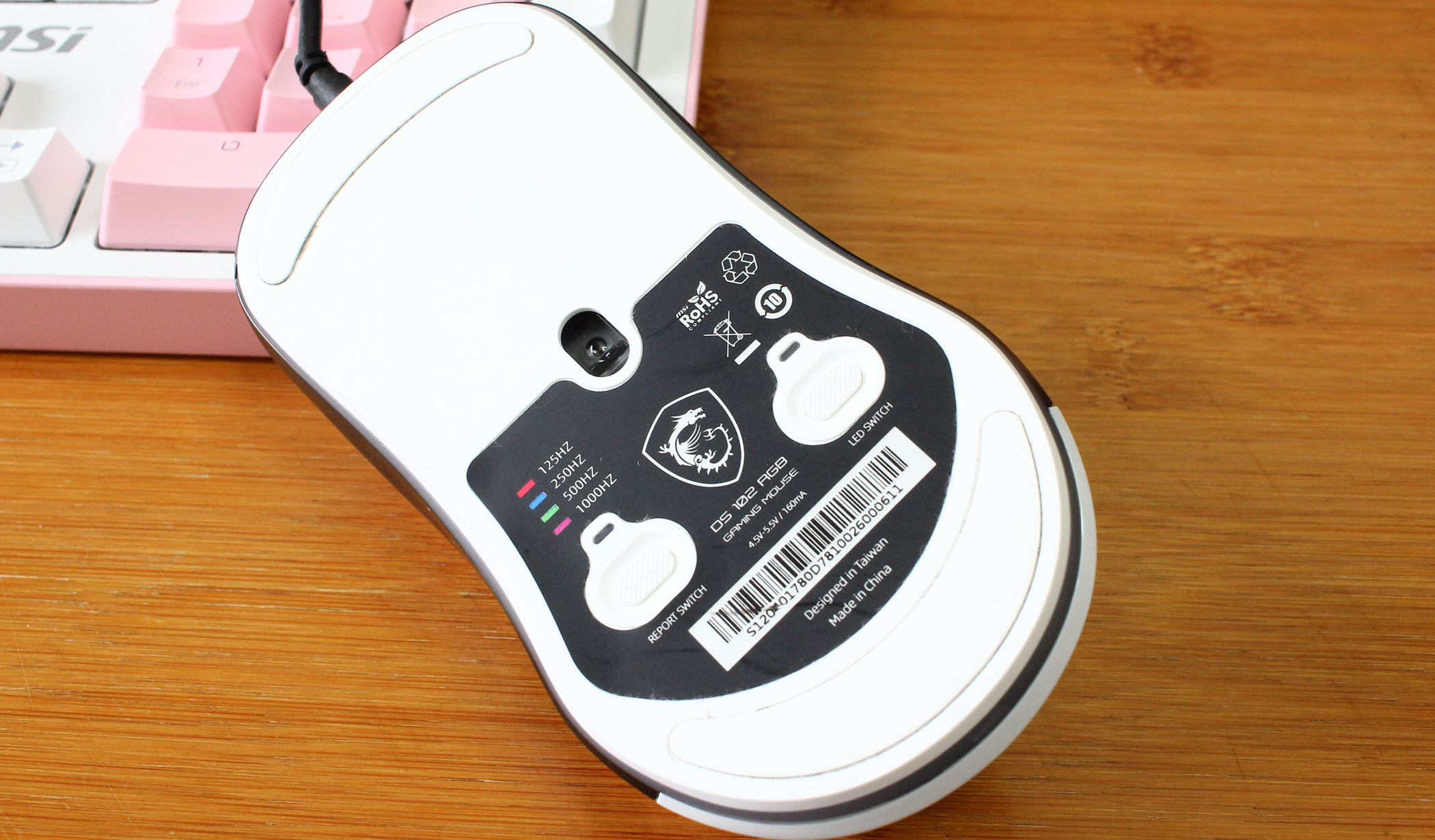 底部可以看到,前面2块白色防滑胶垫+尾部一个超目测220°度弧形防滑胶垫,防滑保护做得很不错,还有微星鼠标都有的信仰龙魂logo及鼠标型号条码各种认证标识,当然最重要的还是光学传感器和DPI切换按键。