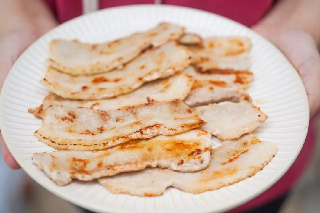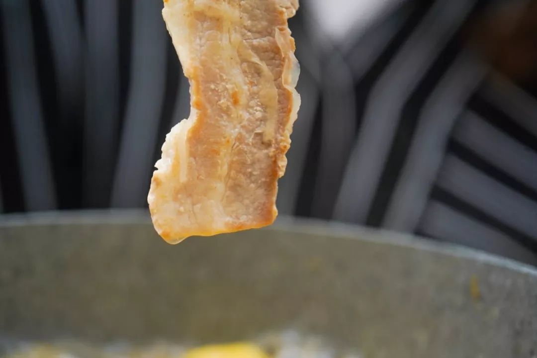 生五花肉下锅,煎出滋滋的焦边。