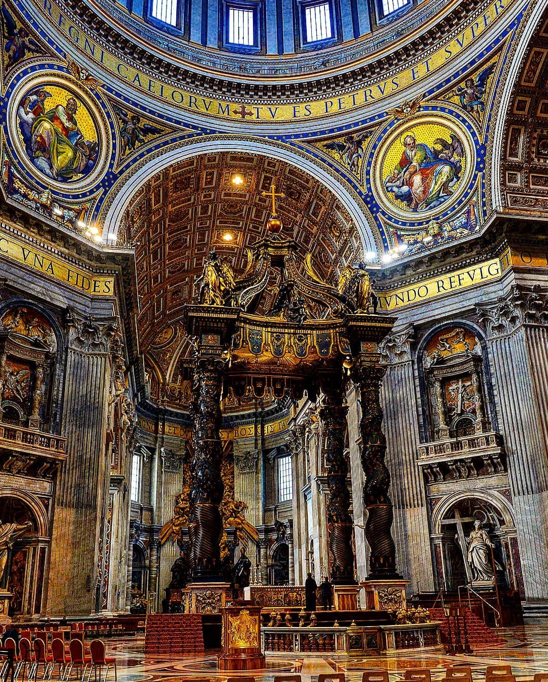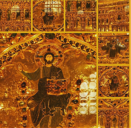 教堂的内部,从地板、墙壁到天花板上,都是精致的镶嵌画作,这些画作上又覆盖着一层闪闪发亮的金箔,使得整座教堂笼罩在金色的光芒里。