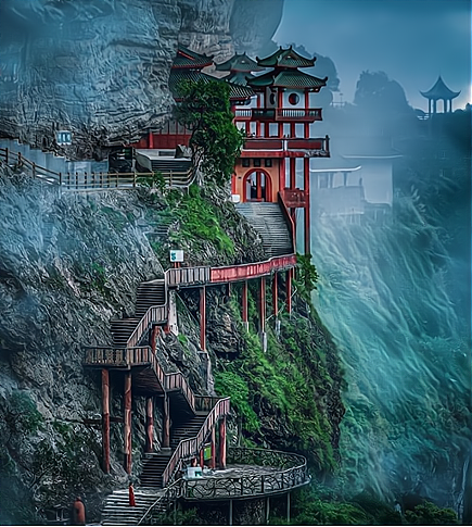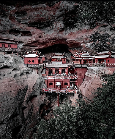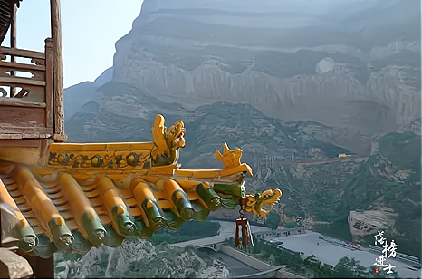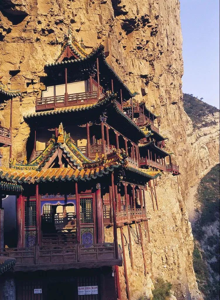 顾名思义就是悬挂在空中的寺庙,远远望去,像一幅玲珑剔透的浮雕,镶嵌在悬崖峭壁之间。