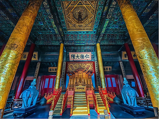 太和殿是皇权的象征,采用重檐庑殿顶这种屋顶结构,殿内沥粉贴金,重施五彩,显得金碧辉煌,雄伟壮丽。
