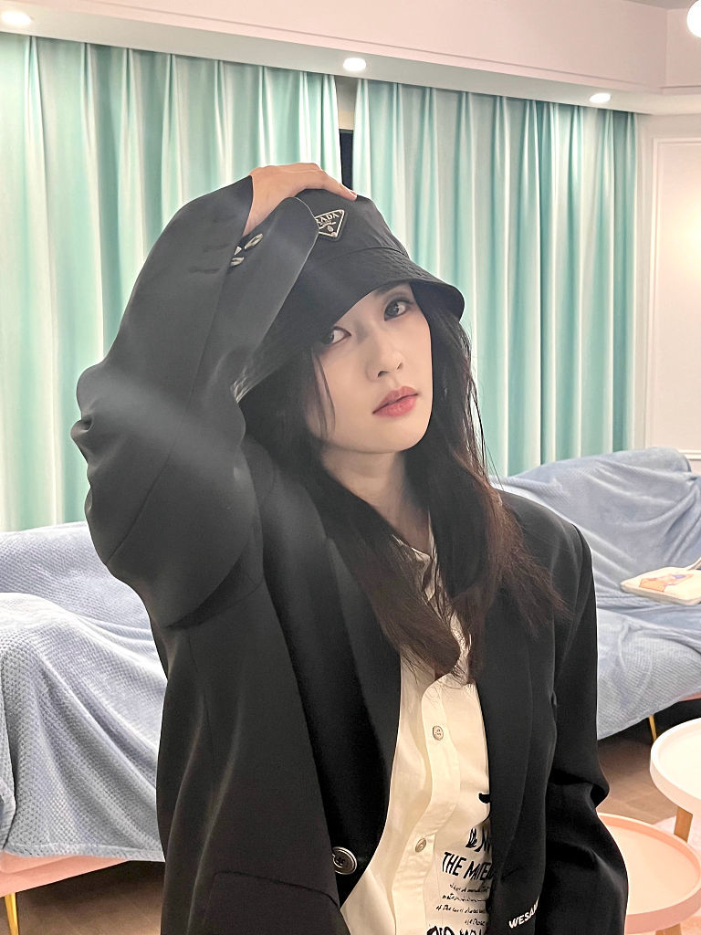近日,白鹿在微博晒美照。她的发型蓬松有度,休闲黑西服搭白衬衫头戴经典渔夫帽显酷酷个性。