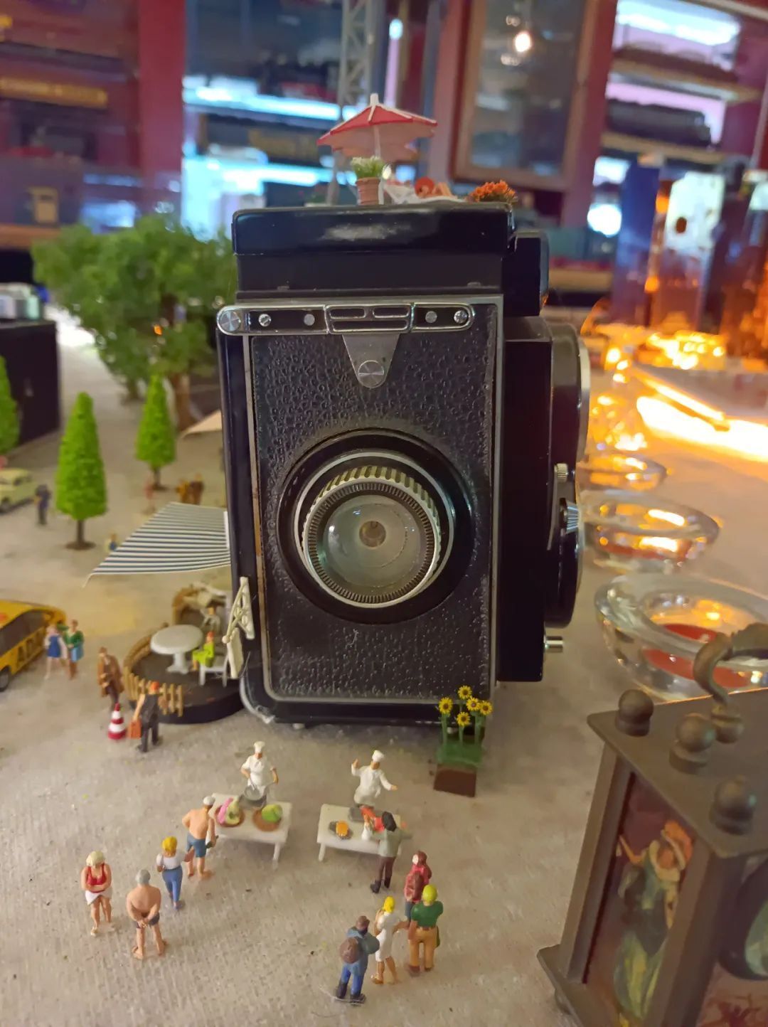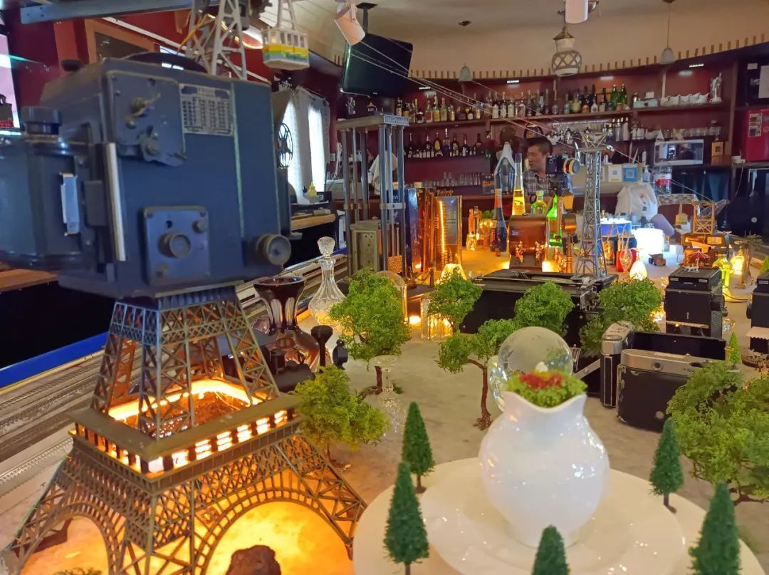 门口吧台附近有一个很大的展示台,外围布着几圈轨道,轨道上还停着几辆型号不同的火车模型。中间的大片空间摆着各种各样的物件,古老的照相机、打字机、电影放映机等,错落有致,并搭配着一些造型各异的人物模型,非常有意思。