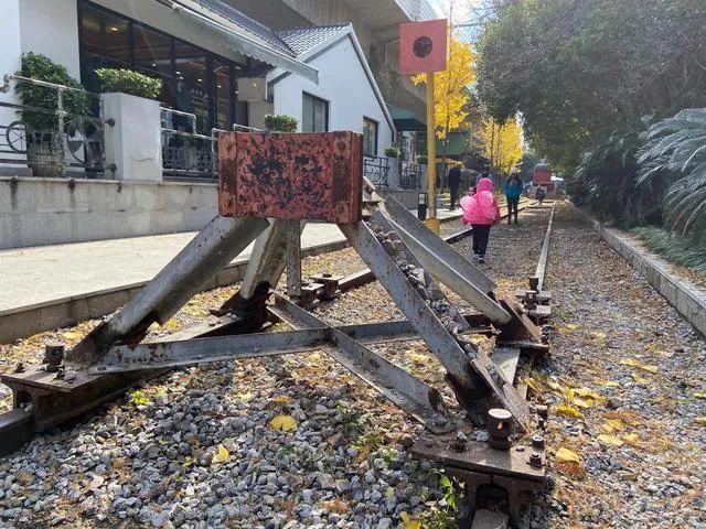 继续前行,我先是被一间车厢旁绿化空间里盘绕的“铁轨”吸引了。这条“铁轨”比真正的轨道要小,在树与花之间盘旋而过,中间还点缀了一些些人物模型,非常有意思。