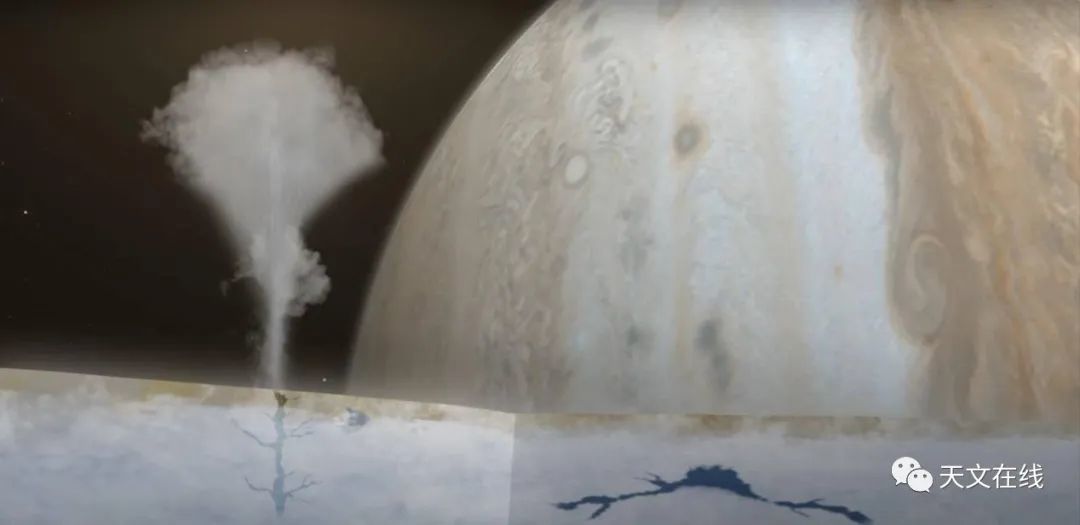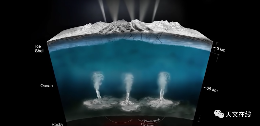图:木卫二表层结构和海底火山示意图(由外至内为冰壳、液态海洋和岩石核心)