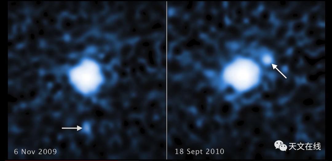 图:共工星(中央)和它的卫星(箭头所指)
