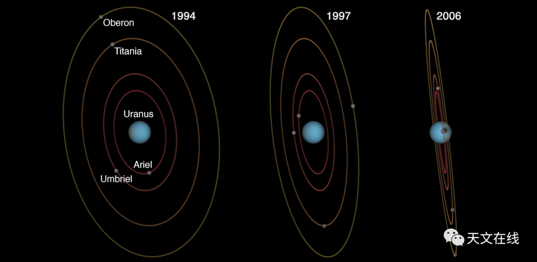图:海王星和它的卫星排列情况,很难出现日食(卫星由外之内分别为天卫四、天卫三、天卫二和天卫一)