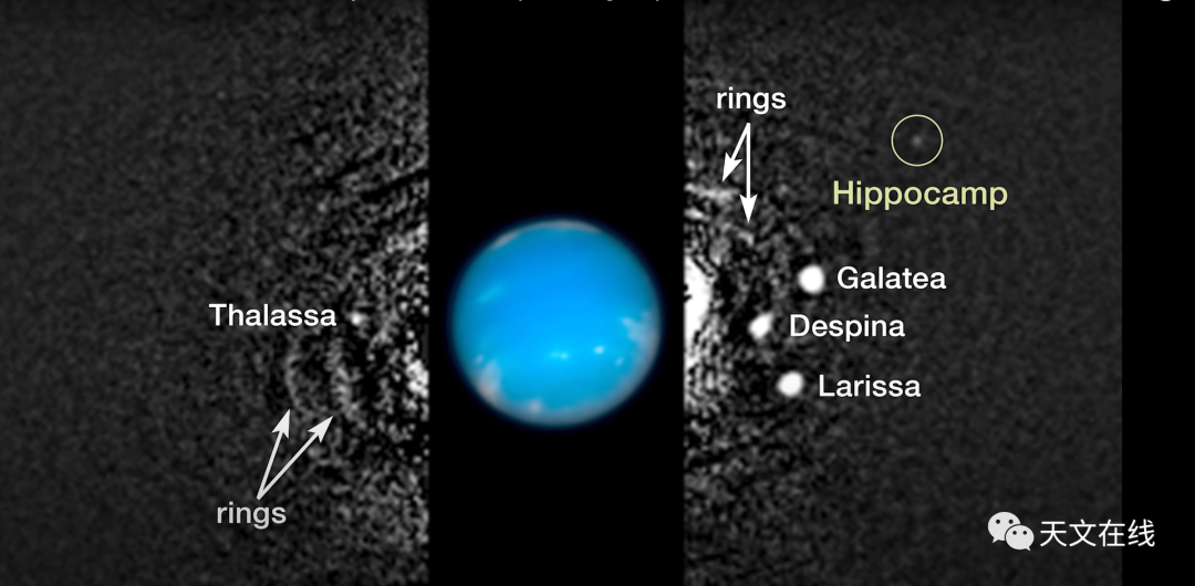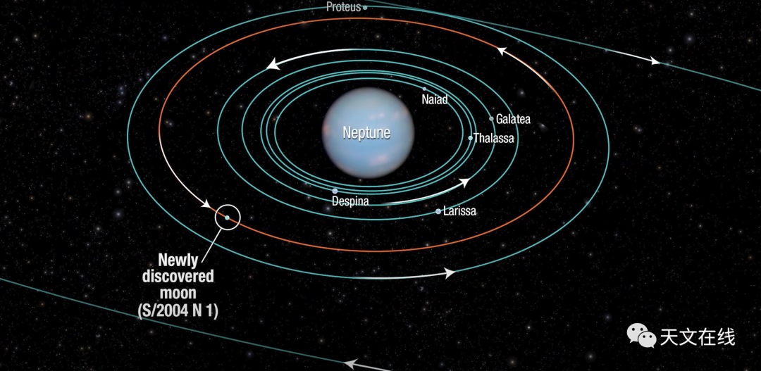 图:海王星的卫星(圈出的是海卫十四,图中未显示完全的最外侧的轨道是海卫一的轨道)