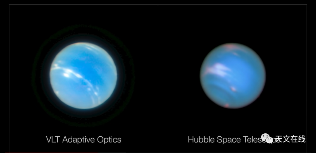 图:VLT望远镜(甚大望远镜)图像分辨率更高,但哈勃望远镜图像保留了更多的细节(像大气层的带状区域和风暴)