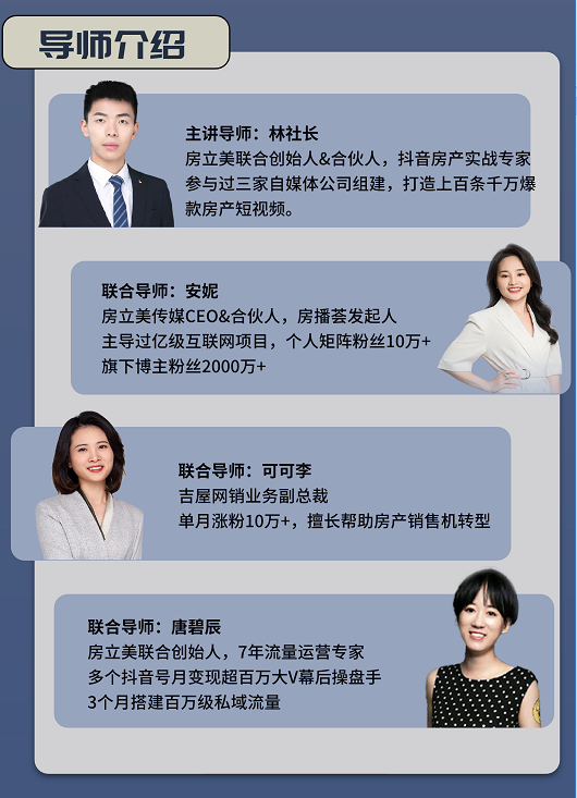 本课程是由房立美多为抖音实战专家、房产从业10年资深专家、通过多次实操总结出的核心经验联合设计的,专为抖音房产小白以及有粉丝基础的抖音初运营房产人打造抖音卖房的实操入门课程,课程涵盖账号的定位、内容策划、拍摄剪辑、直播到运营的全系统教学内容,从多个方位教会房产人如何从0 到1打造高转化房产号,打造“房产界的李子柒”,在学习运营技巧的同时,还有专业的摄影后期课程,带你从根本解决内容呈现问题,理论+实操双重保障,为你的视频效果负责!