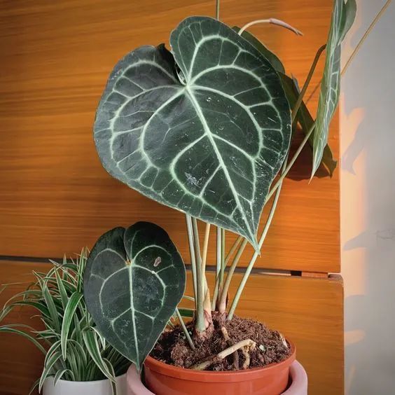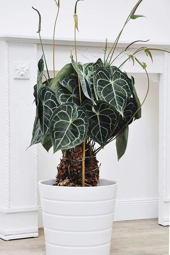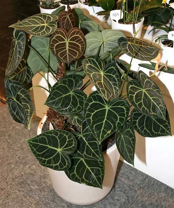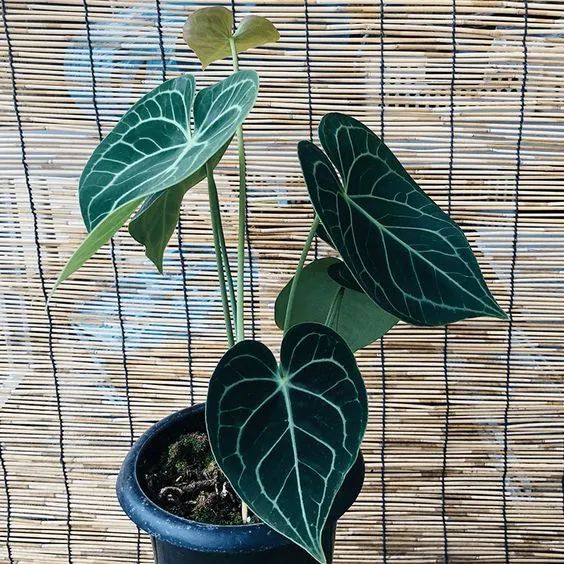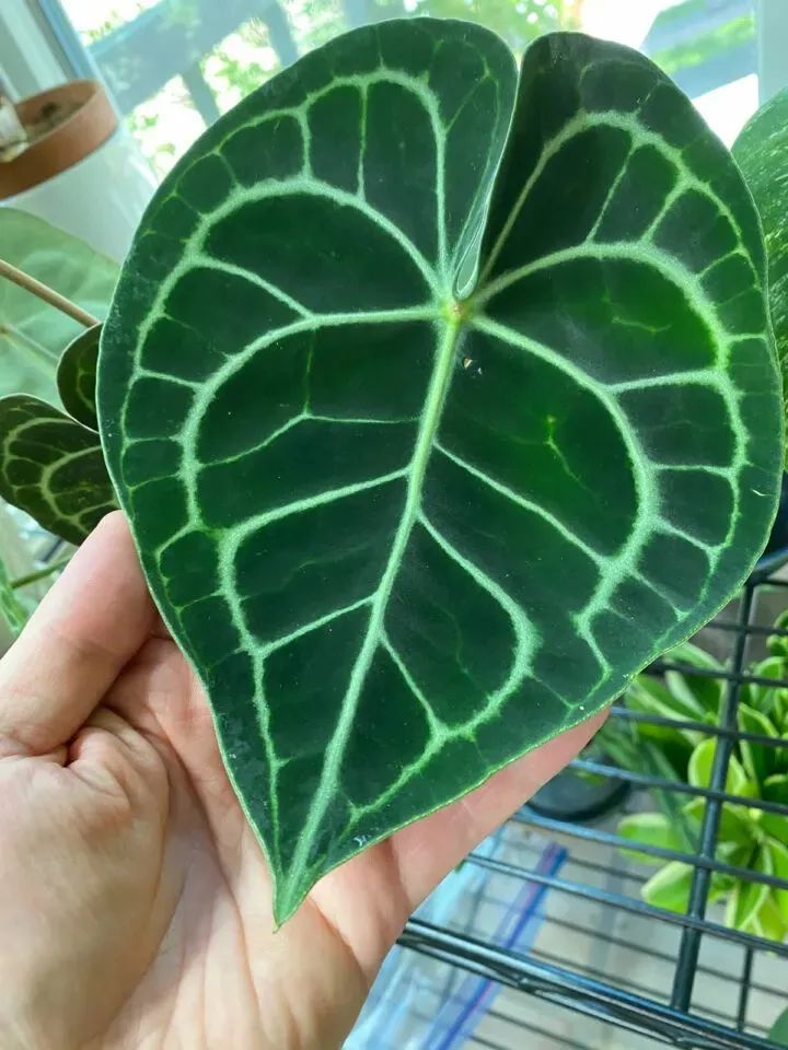 明脉花烛的叶子是整体是呈心形的,叶面整体是墨绿色的,而且叶子摸起来有天鹅绒般的质感,会从叶柄基部长出掌状的银灰色叶脉,次叶脉则是羽毛状的。