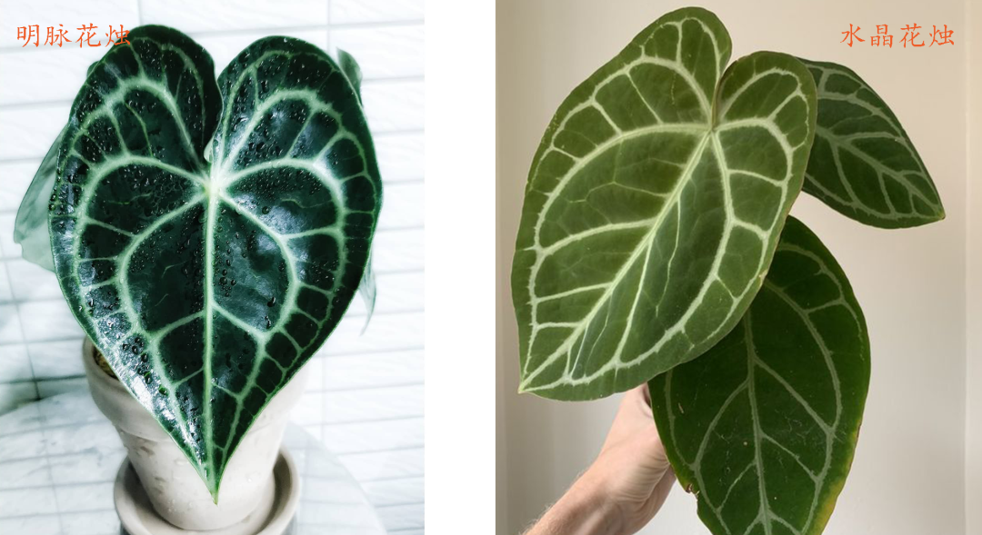明脉花烛(Anthurium Clarinervium)和水晶花烛(晶状花烛,Anthurium crystallinum)的区别: