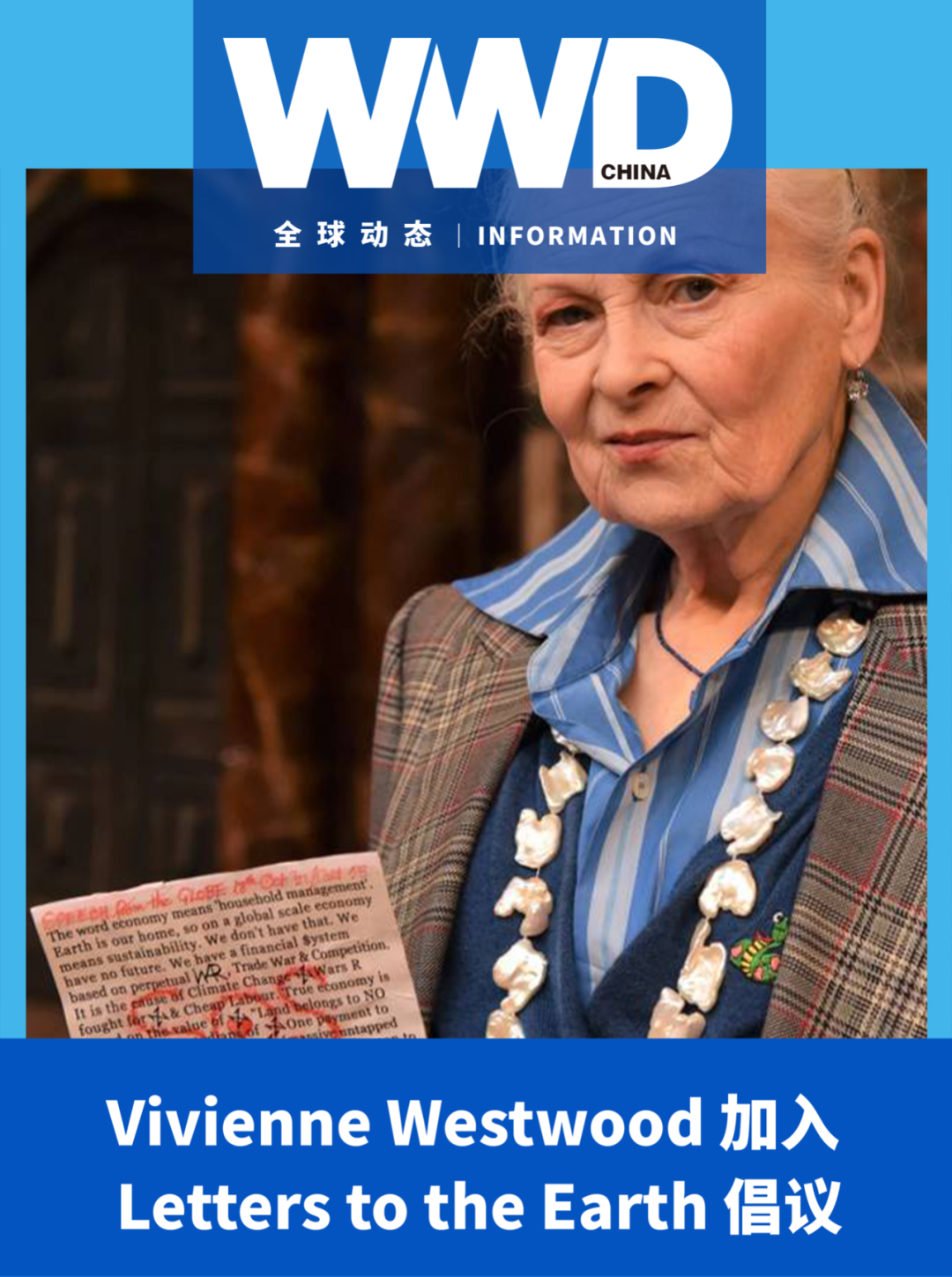 近日,英国设计师 Vivienne Westwood 宣布,加入可持续发展倡议 Letters to the Earth。10月 29 日,她将通过该倡议以演讲的方式发布自己的“致地球的一封信”。联合国气候变化会议(COP26)开始之前,Letter to the Earth 每天都会发布一场演讲,呼吁人们关注环境问题。Letter to the Earth 是一项全球运动,邀请人们写下自己对于气候和生态变化的创造性解决方案。很多颇具声望的公众人物都加入了这项倡议,例如尼日利亚作家 Ben Okri 与小野洋子等等。(Usasa)