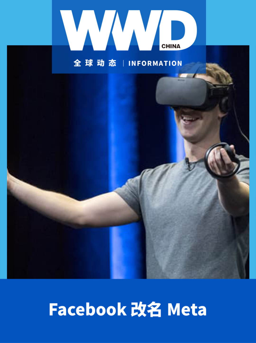 10 月 28 日,Facebook 首席执行官扎克伯格宣布,Facebook 将更名为 Meta。“Meta”即元宇宙 Metaverse 的前缀,意为包涵万象,无所不联。扎克伯格表示:“我们初心不改,所有的应用和品牌也不会改变。Meta 仍然是一家以人为本研发科技的公司。但现在我们有了一个新目标——把虚拟世界变为现实。”12 月 1 日起,Facebook 股票将以新代码“MVRS”进行交易。(Usasa)WWD