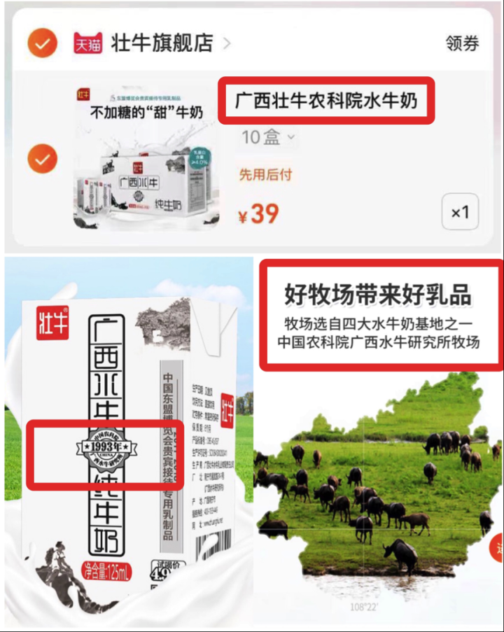 通过天猫旗舰店可以发现,“壮牛”宣传称其产品为“广西壮牛农科院水牛奶”,并且在售产品的包装显著位置标有“中国农科院广西水牛研究所”标识。与此同时,该店还宣传称其养殖牧场是“中国农科院广西水牛研究所牧场”。