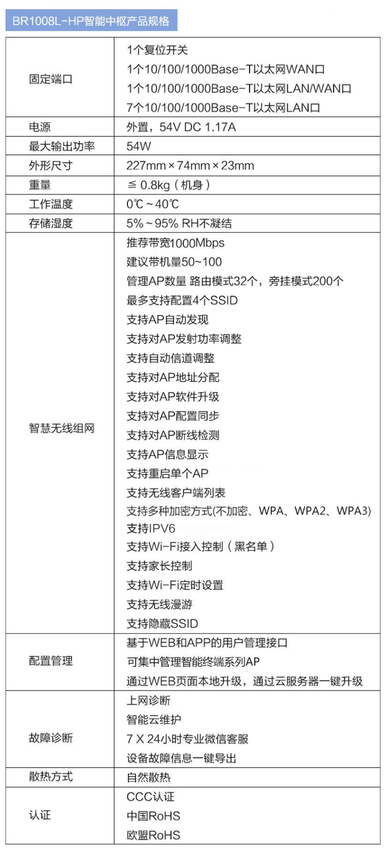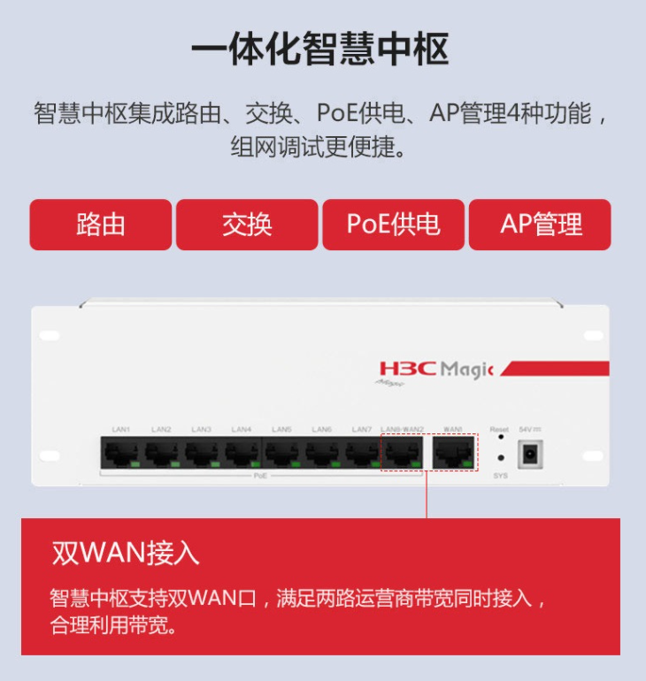新华三 Magic BH3004 系列包含的一体化智慧中枢(AC),集成了路由、交换、PoE 供电功能,支持双 WAN 接入。产品提供 8 个千兆网口,可以管理多个 AP 设备,采用外置 54V DC 1.17A 供电。