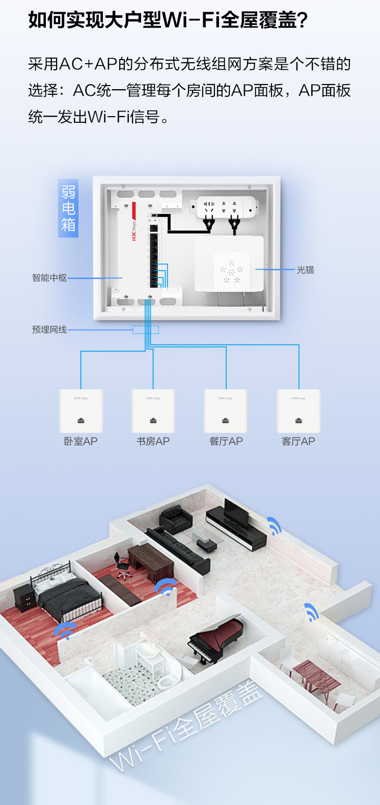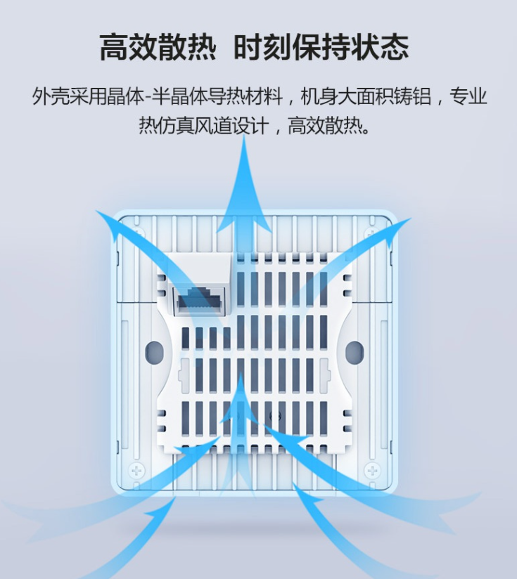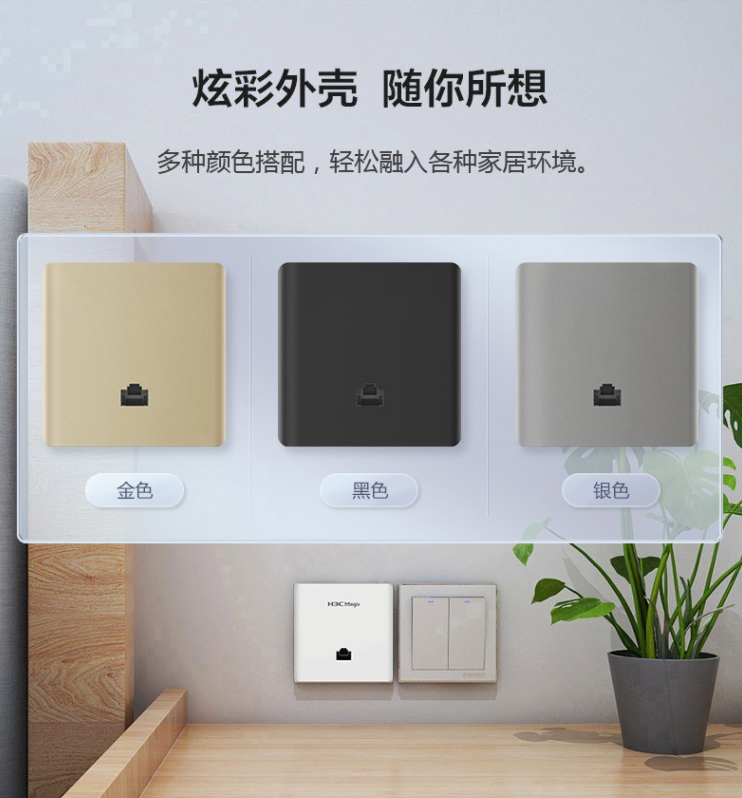 面板 AP 厚度仅为 15mm,背面的网口为 45 度角倾斜设计,便于施工。此外,产品还提供多种颜色的面板可选,以适应家庭装修风格。