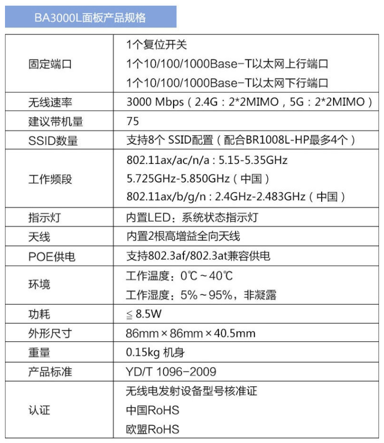 据IT之家了解,无线方面,产品提供 3000Mbps 的速率,支持 MU-MIMO 技术,单个 BA3000L 面板 AP 带机量 75 台,内置两根天线。以下为详细参数:
