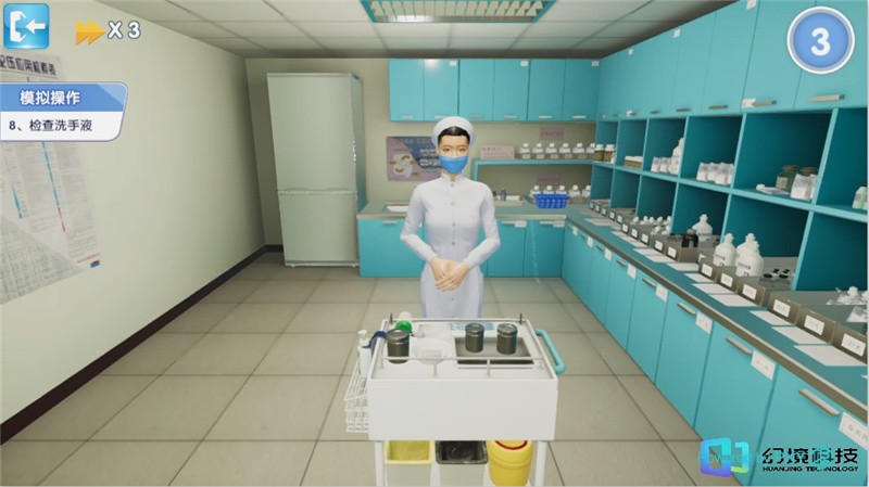 VR技术仿真和交互的特性,能将抽象、晦涩难懂的知识以更生动、直观、全面的方式呈现,用沉浸式体验增强学生的代入感。例如实践性强的护理学内容学生单纯从理论课上学习很难在脑海中形成一个完整的概念及流程,但是VR可以模拟三甲医院的护士站、处置室、病房、配药房等临床场景,让学生“进入”这些场景进行护理仿真实训。