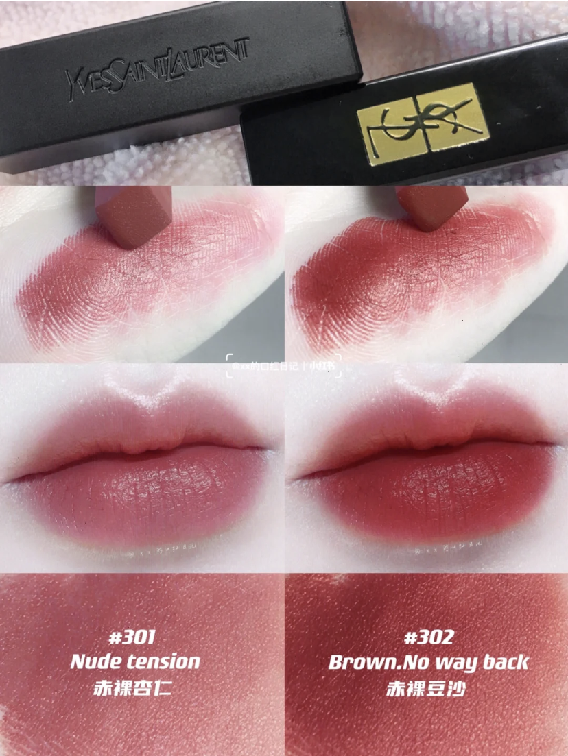 这两支先放一起比较吧,感觉是经过精雕细琢的两款颜色,半哑光质地,依然是熟悉的香味,上嘴颜色饱和度不高,有一点半透明的质感。301是比较裸的杏仁粉,带了点橘棕调,像是甜甜的蜜桃,减龄的优秀选手;302气质型豆沙色,暖色调抬气色,薄涂日常温柔,素颜心机,厚涂有甜酷感,是搭配轻欧美妆的一把好手