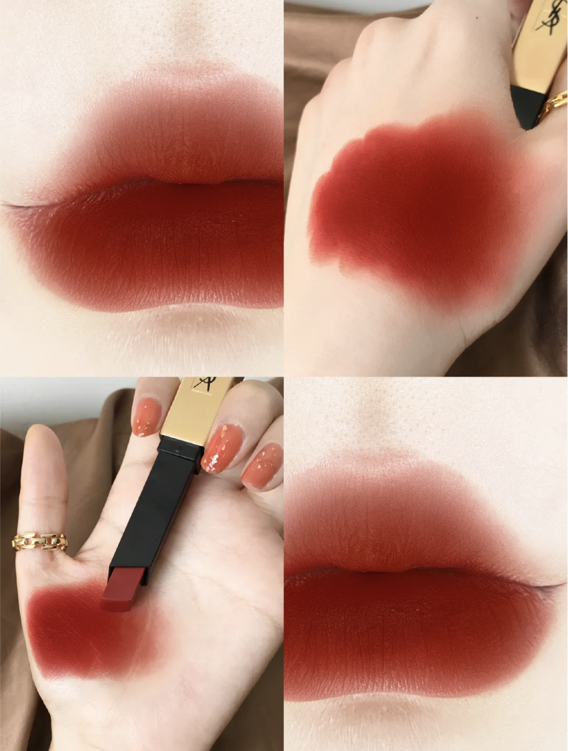 很浓郁的焦糖红棕色,和秋天绝配,轻盈慕斯质地真的很舒服,上嘴是绵绵的奶油感,不厚重,显白不挑皮,黄皮唇色深的集美都可以闭眼入的色号。薄涂是显白的小辣椒,厚涂是复古味十足的铁锈红,浓郁的秋冬感。