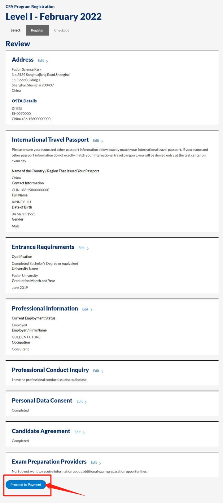 Step13.确认填写的个人信息是否有误,有问题提前修改,若没问题,点击"Proceed to Payment"确认账单并支付,最后确认确认报名费用,提交报名信息(推荐支付宝)