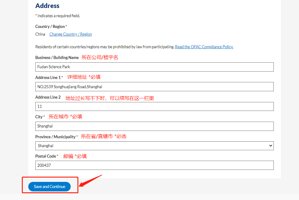 Step4.填写详细地址(使用英文、拼音,不要使用中文),确认无误后点击“Save and Continue”进入下一步。