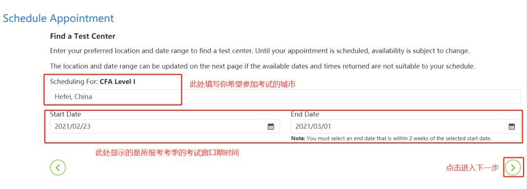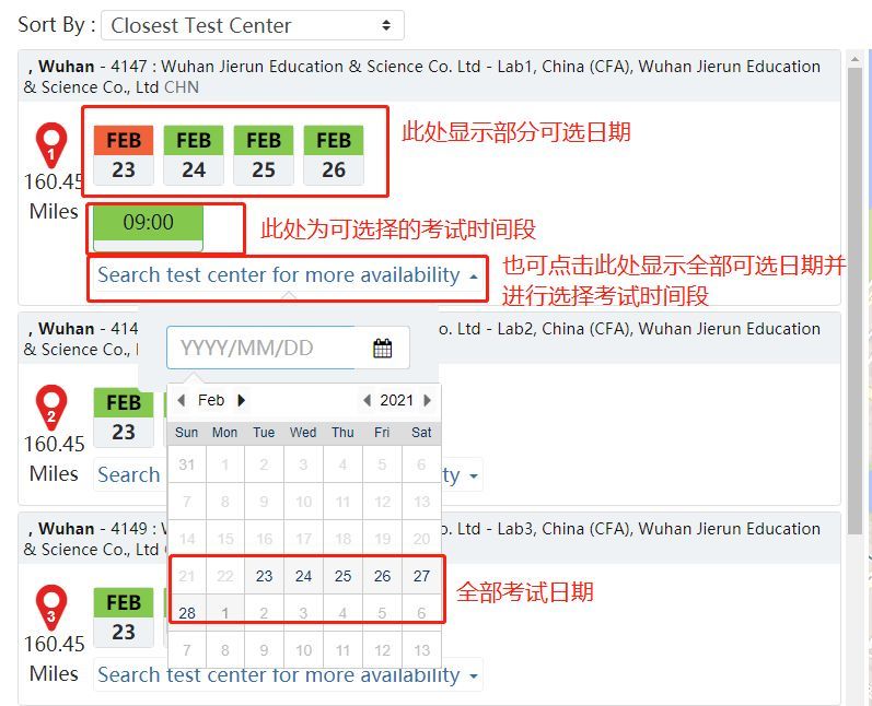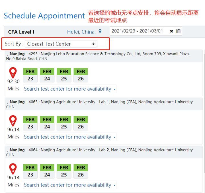 Step 4.选择考点及考试时间,若所选城市无考点安排,将自动显示距离所选城市最近考点(距离按miles计算);