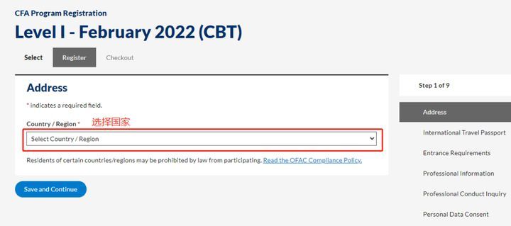 Step3.选择自己对应的国家,点击“Save and Continue”