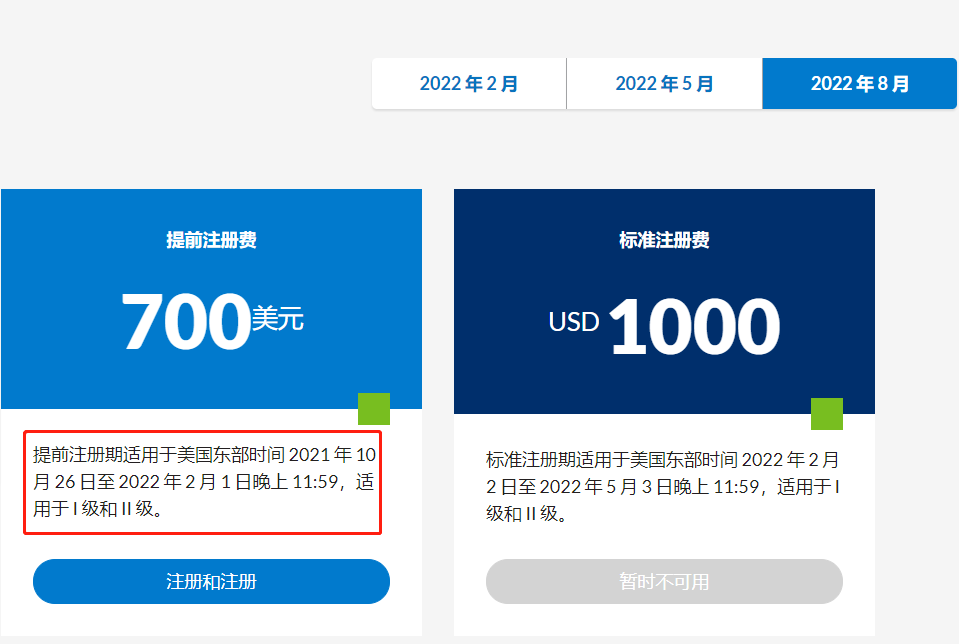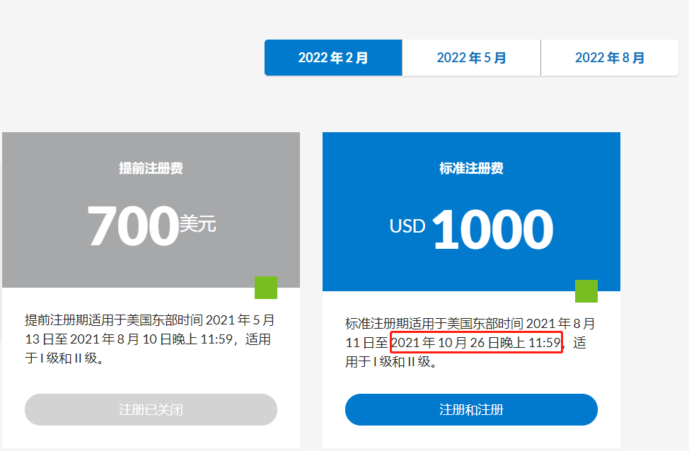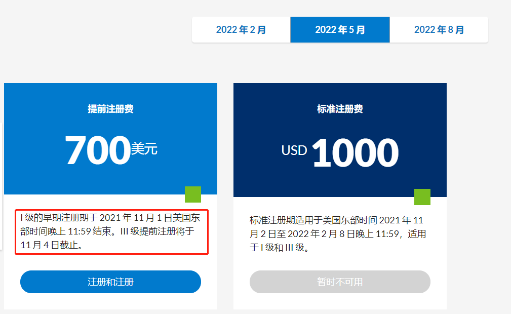 5月报名时间及费用请点击查看此篇:《定了!2022年5月CFA报名费即将涨价!还能不能好了……》注意5月一级的提前阶段于2021年11月1日美国东部时间晚上11:59结束,三级提前阶段将于11月4日截止。