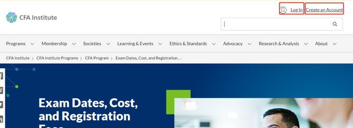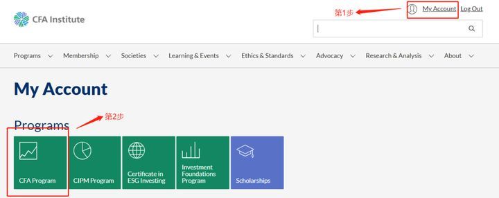 Ste1. 注册成功后开始报名CFA考试,点击网页右上角“My Account”按钮,在跳转后的页面点击“CFA Program”,