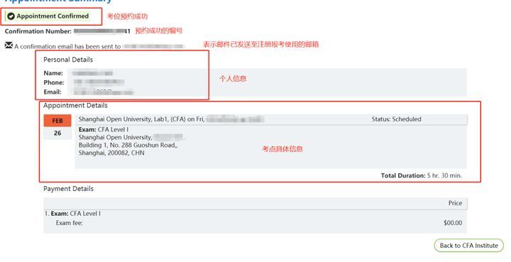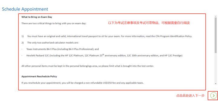 考位预约—在付款被成功处理后,考生可以在CFA Program模块下看到“schedule your exam (考位预约)”链接,点击链接后,将进入Prometric的考位预约界面,选择具体的考试日期、时间和地点,确认并完成考试预约。