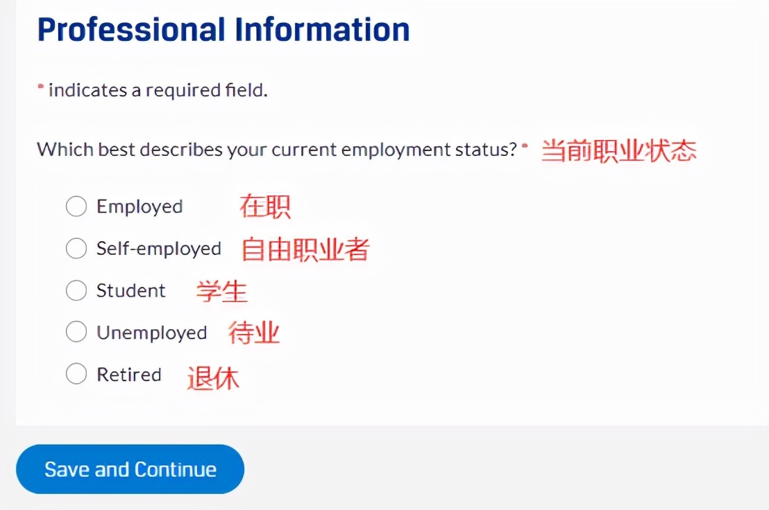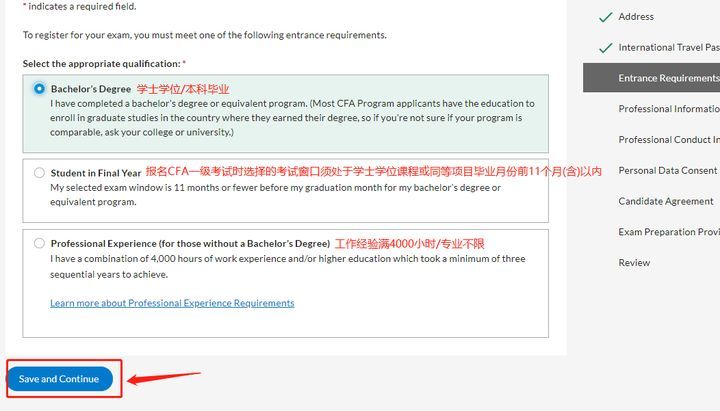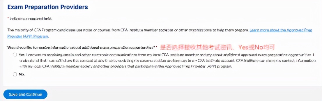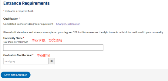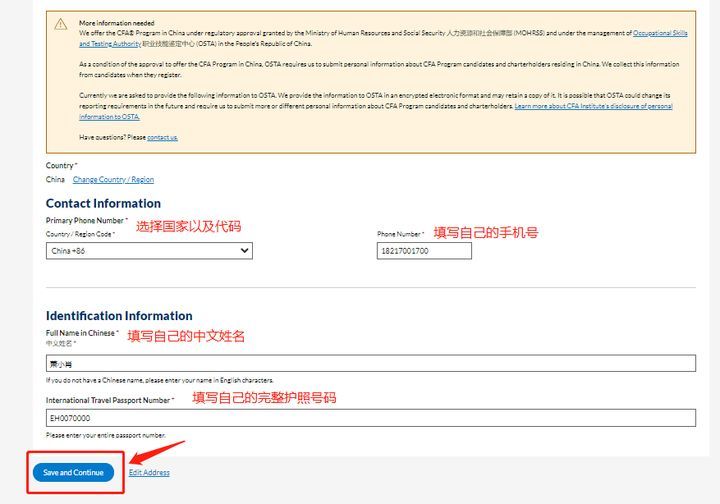 Step5.如果地址选择了中国,会跳转到如下页面,会发现是人社部要求收集CFA考生的信息,按要求填写即可,确认填写无误后点击“Save and Continue”按钮继续。