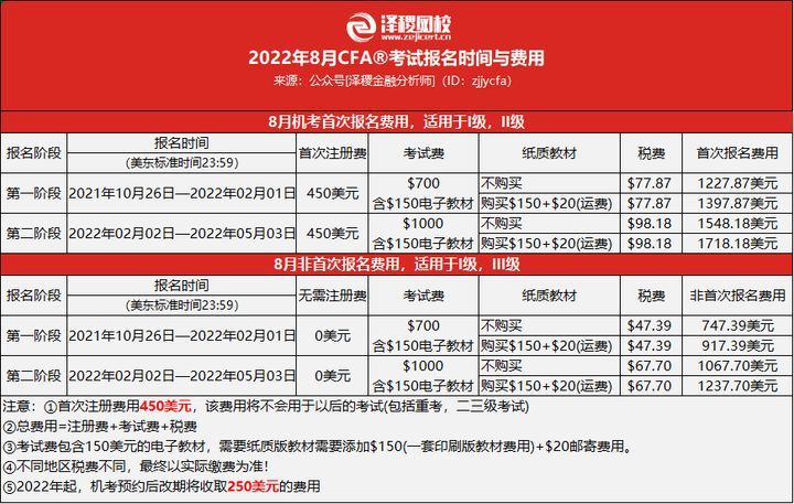2022年8月CFA考试(包含一级二级)报名各阶段时间费用如下: