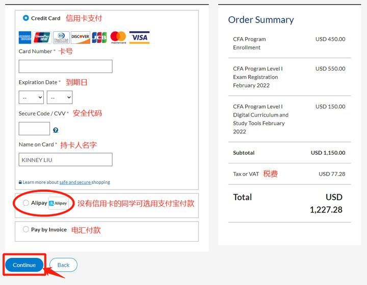 Step14.选择支付方式,国内考生请优先选择信用卡或支付宝付款。