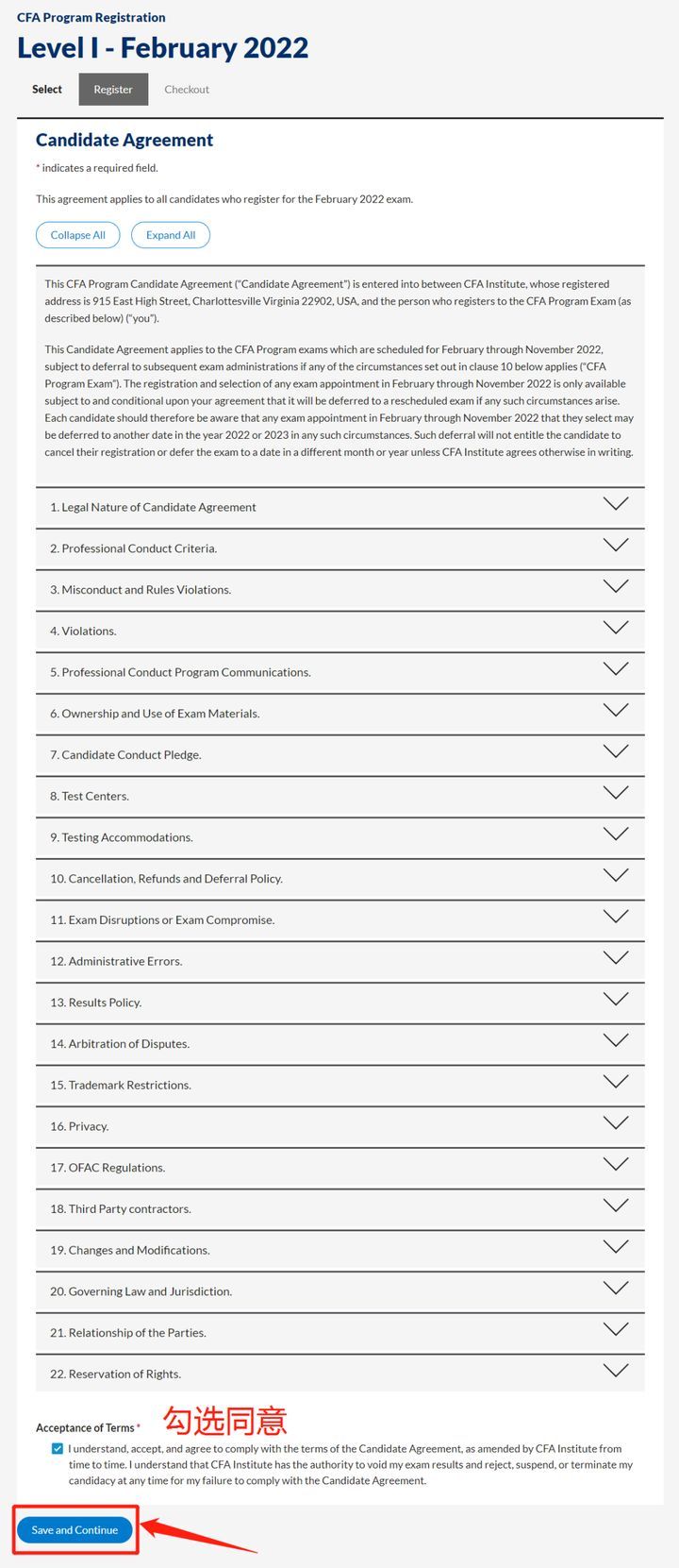 Step11.签署候选人条款,直接拉到最下方,勾选同意后点击“Save and Continue”按钮继续。