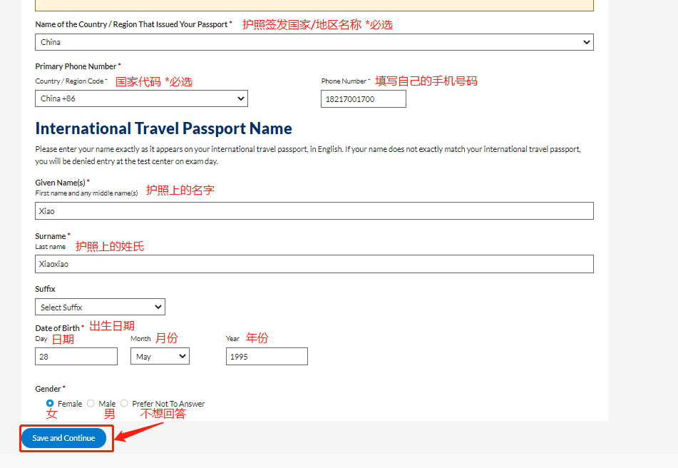 Step6.填写护照信息(重要,对照护照填写,不要填错),填完后点击“Save and Continue”按钮继续。