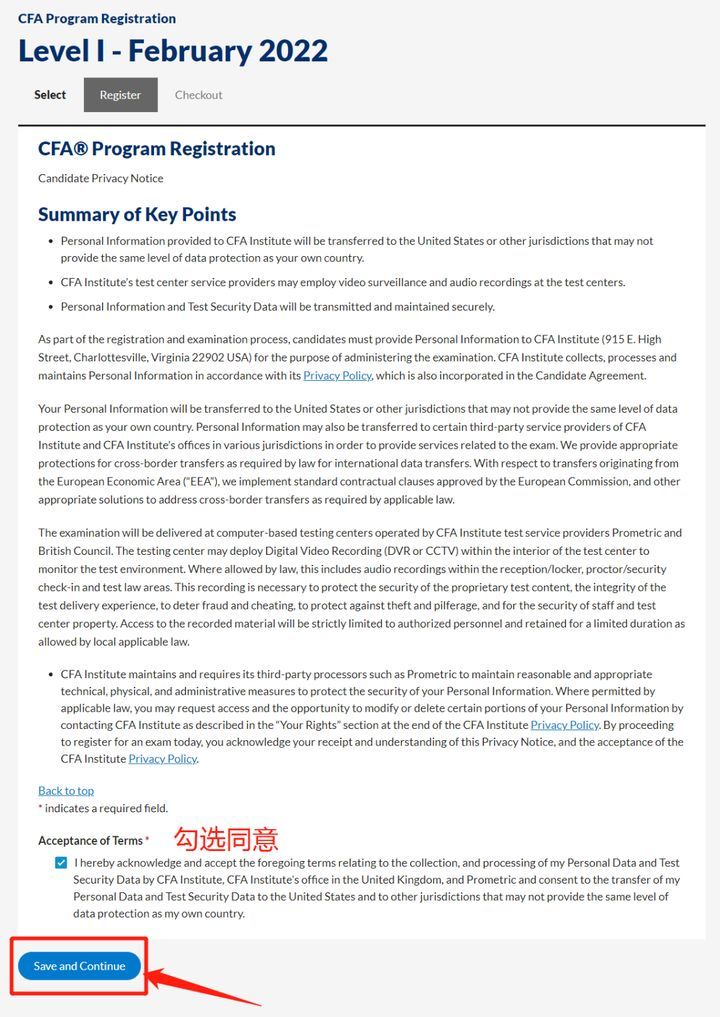 Step10.个人信息声明,直接拉到最下方,勾选同意后点击“Save and Continue”按钮继续。