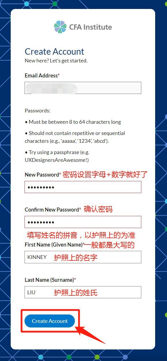 Step6.验证完成后,按下图指示依次填写完成,并确认无误后,点击“Create Account”按钮提交,即可注册成功,(注意不要填写中文)。