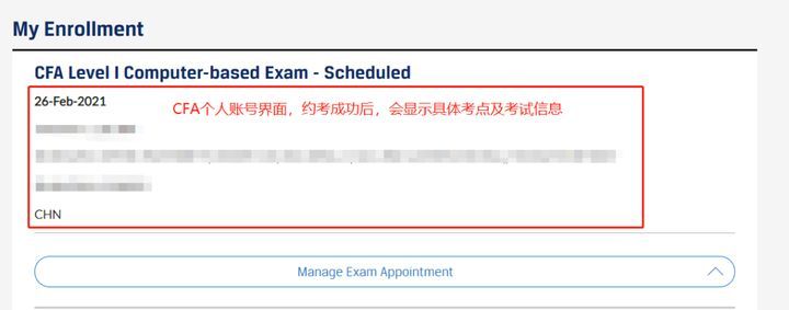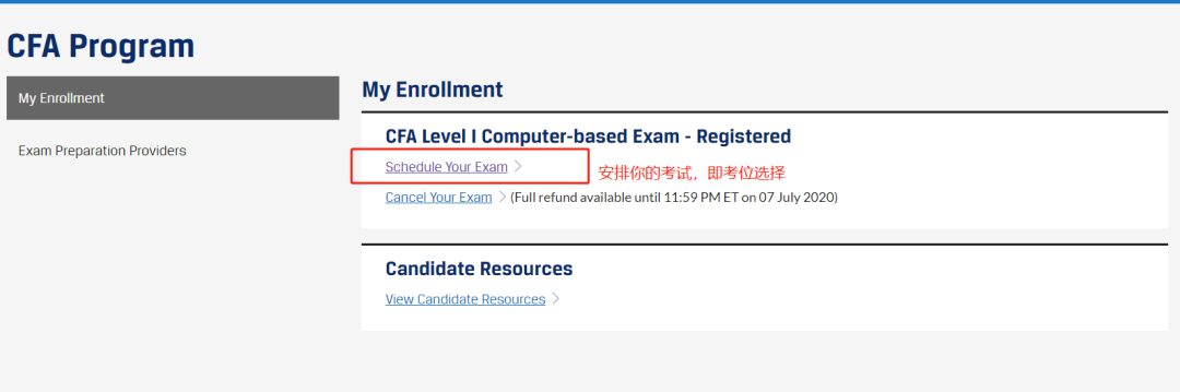 Step 1.报考成功后,将进入以下界面,点击“Schedule Your Exam”(或进入官网首页右上角“My Account”,跳转后点击“CFA Program”,进入考场预约页面);