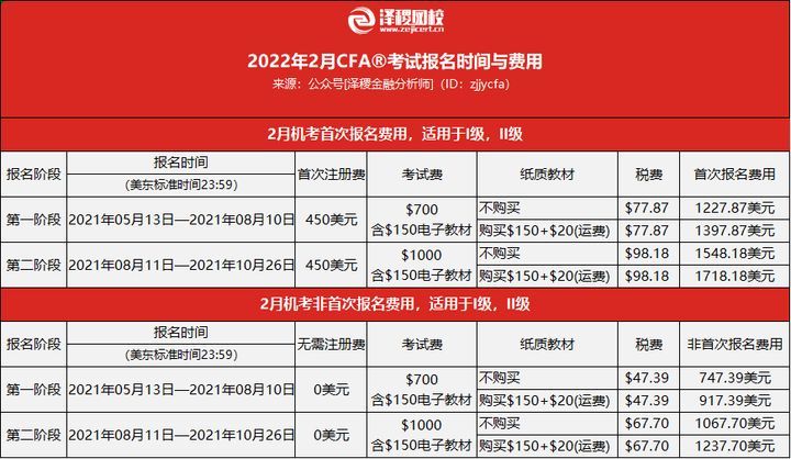 2022年2月CFA考试(包含一级二级)报名各阶段时间费用如下: