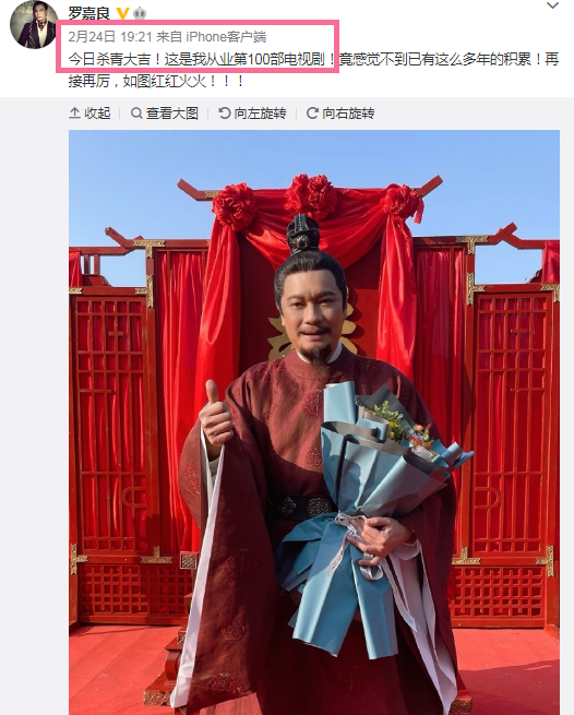 今年2月,罗嘉良在网上发出一张古装剧照,宣布自己从业第100部电视剧杀青,该剧是改编自温瑞安同名原著小说的古装武侠剧《说英雄谁是英雄》,罗嘉良在剧中饰演蔡相。