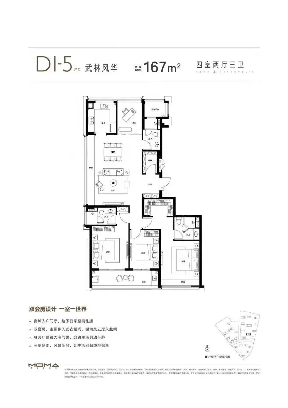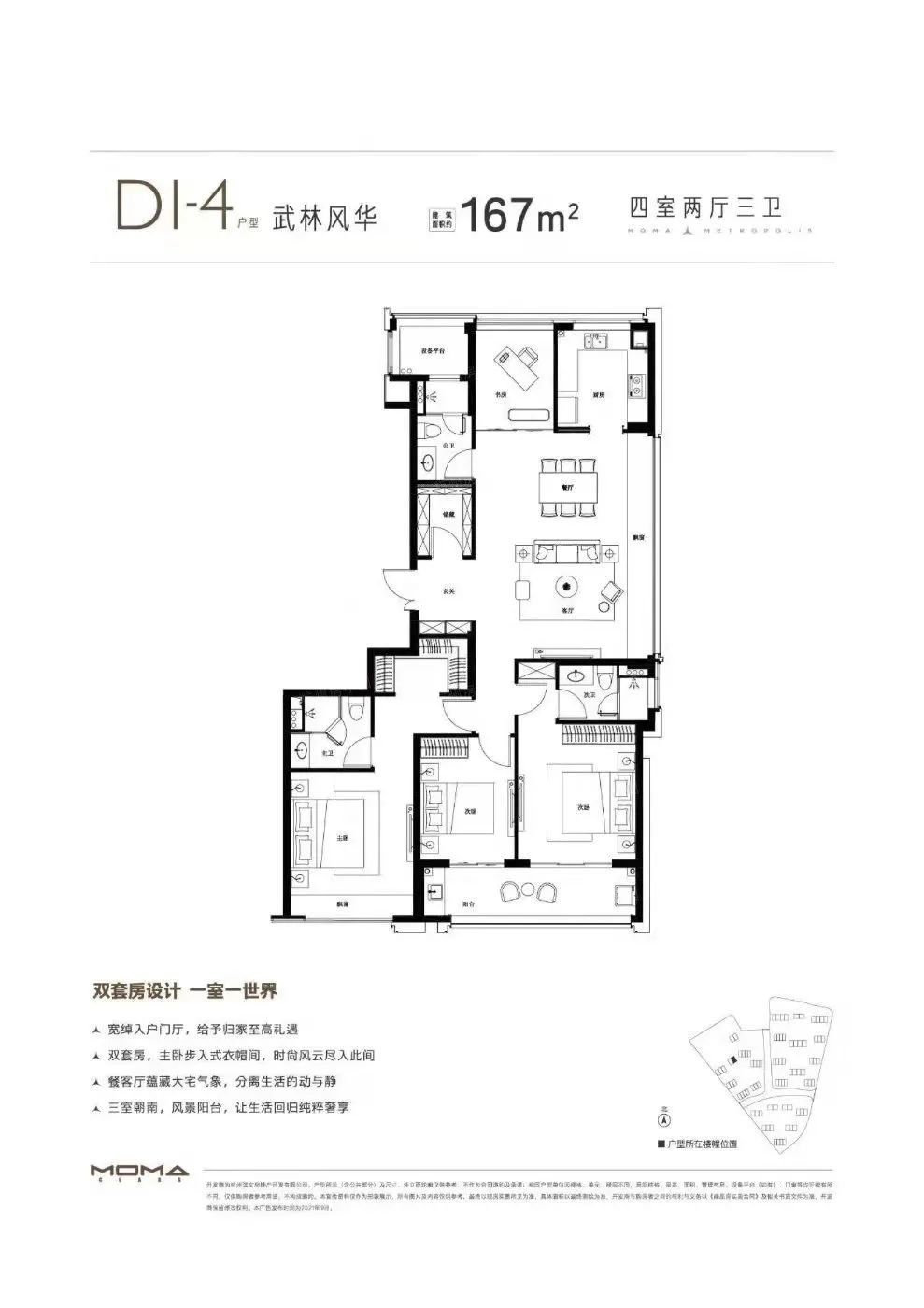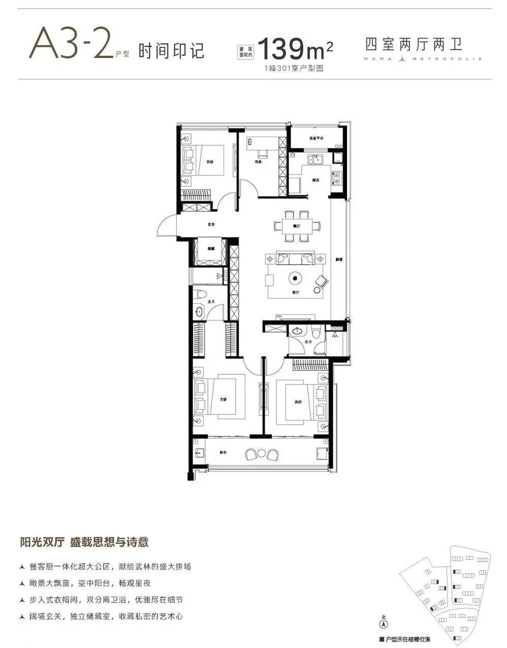 优点:类四叶草户型;两房双通南阳台;全明户型;四房两卫功能性较好;U型厨房;侧边双厅大飘窗;有储藏室;