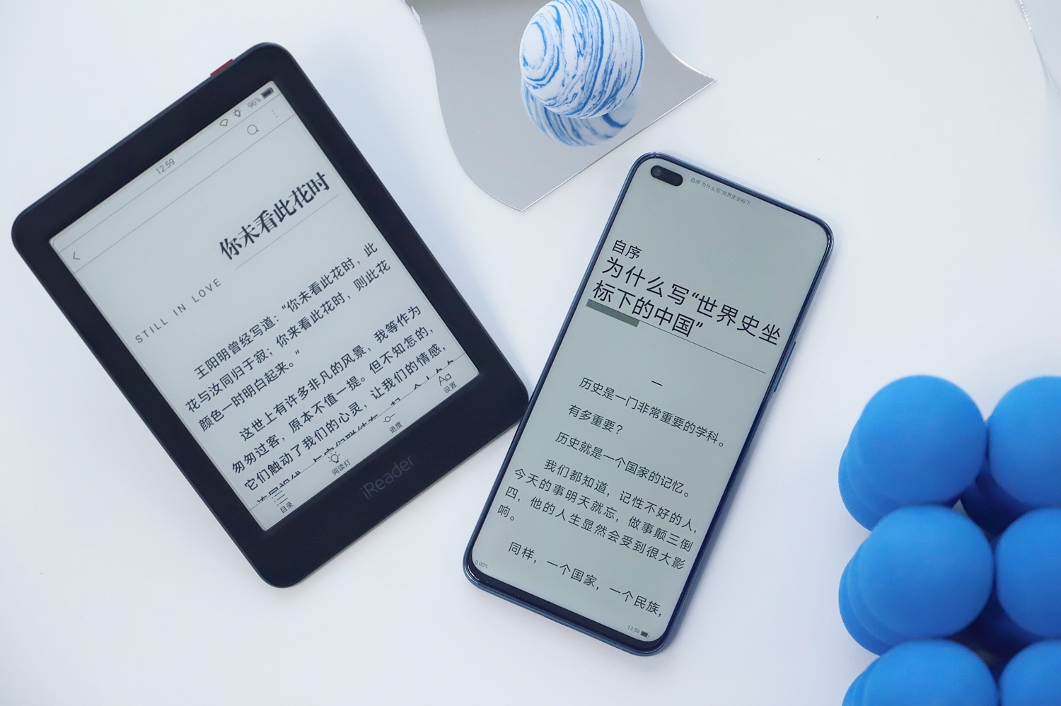 我拿出尘封许久的iReader掌阅电子书和荣耀Play5 活力版来对比一下,可以看到得益于色温、亮度和灰度控制的专利技术,电子书模式下手机的显示效果非常接近iReader水墨屏的视觉效果,甚至在字体清晰度和细腻度以及操控灵敏度上手机的体验会更好一些。