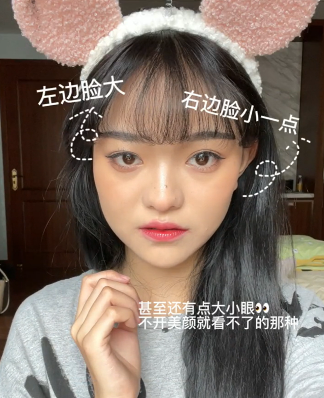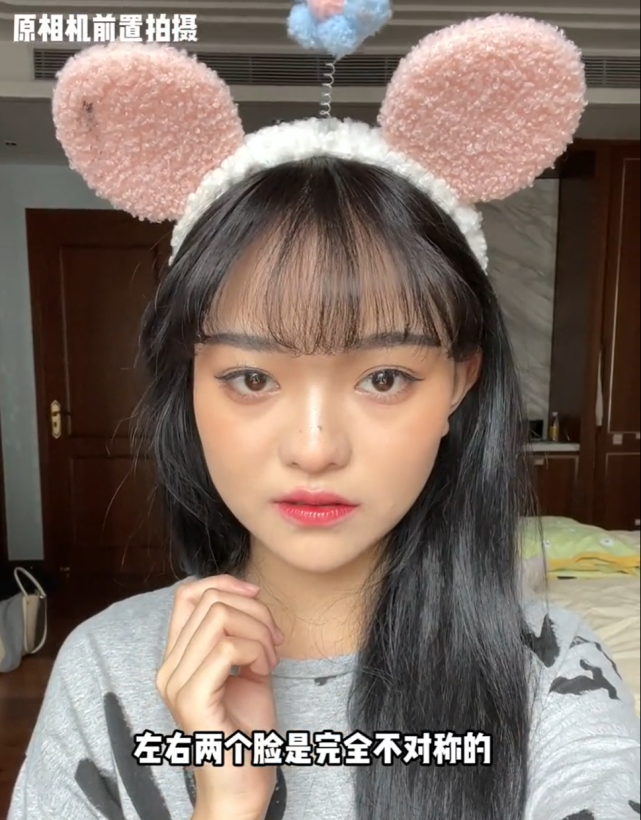 为了能让大家直观看到左右脸不对称,陈意礼特意关掉了美颜滤镜。在高清原相机下,陈意礼的脸的确是左右不对称,还有大小眼的既视感。而在加了厚重美颜滤镜的镜头下,就几乎看不出来。